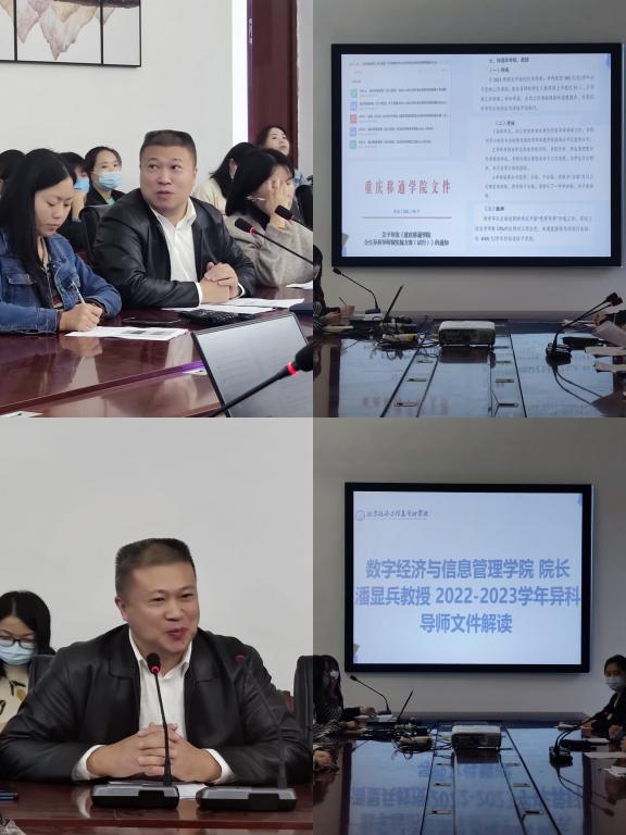 会议第四项,由数字经济与信息管理学院潘显兵院长为各位老师介绍数字经济与信息管理学院对于全生异科导师具体事宜的相关安排。潘显兵院长就全生异科导师制实施方案的文件为大家进行了解读,潘院长在其中强调了“考核、激励、待遇”三点,为各位老师说明了异科导师不仅能为学生带来益处,更是对于老师自己的一场蜕变。此外潘院长还强调了组织开展教师工作评议小组的制度和构成,以及评议小组认定异科老师合格的指标,如发行新闻稿等,并表达对历届异科导师们的信任和感谢。