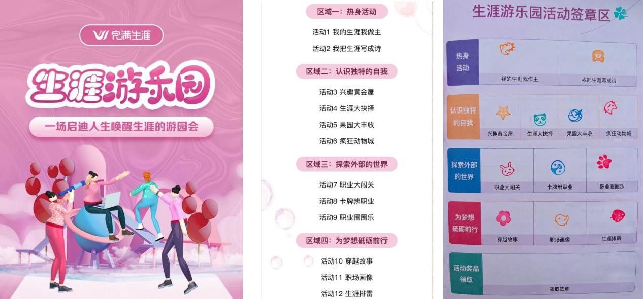 “吾生也有涯,而知也无涯”是将职业生涯规划元素设计成系统的生涯游乐园体验活动,主要面向大一、大二全体学生,分别由“热身活动”、“认识独特的自我”、“探索外部的世界”和“为梦想砥砺前行”这四个区域组成,每个区域都包含了形式多样、富有趣味的活动项目。学生通过12个户外闯关游戏的形式体验其中,在充满趣味性的自我探索的基础上,初步形成职业生涯规划意识,提升职业规划和就业能力。
