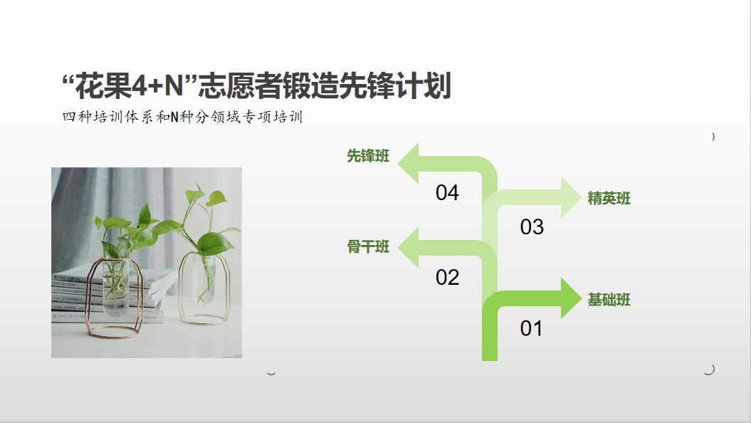 我校于2017年启动“花果 4+N”志愿者先锋锻造计划,致力于为我校选拔志愿骨干榜样,现已完成四期精英班的培训。“花果计划”全力打造“4+N”模式下的志愿服务孵化机制,形成“种(基础班)、芽(骨干班)、花(精英班)、果(先锋班)”4 级培训体系和 N 种分领域专项培训。旨在培养具有社会责任意识与服务意识的骨干型志愿者,营造良好校园志愿服务氛围,引领全校志愿服务事业良好地生长和发展。