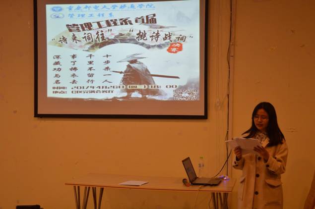 即便阴雨绵绵,也阻挡不住一群诗词爱好者内心的狂热。经过初赛、复赛的激烈比拼后,管理工程系首届“诗来词往”之“挑战诗词”决赛于4月26日在C区完满会客厅迎来决赛。管理工程系团总支书记杨凯老师以及管理工程系主席团成员出席本次比赛并担任评委,我校科创社为本次比赛提供了技术支持。