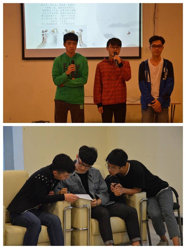 在第一轮风采展示中,第一组选手以藏头诗的诗句介绍他们自己,在精彩的诗句中既有着他们对爱情的美好,也有着作为一名大学生,对于未来的迷茫与思考;“天生我才必有用,千金散尽还复来”是第二组选手的自我介绍,他们用诗词向我们展示了一个对生活积极乐观,对未来毫不退缩的三个男孩;第三组“对对队”用优美、典雅的诗句介绍了三人不同的特点以及在比赛中会表现出“长风破浪会有时,直挂云帆济沧海”的毅力;最后一组“管工最‘骚’队”每个人都身怀绝技,以白话文和文言文的形式介绍自己。