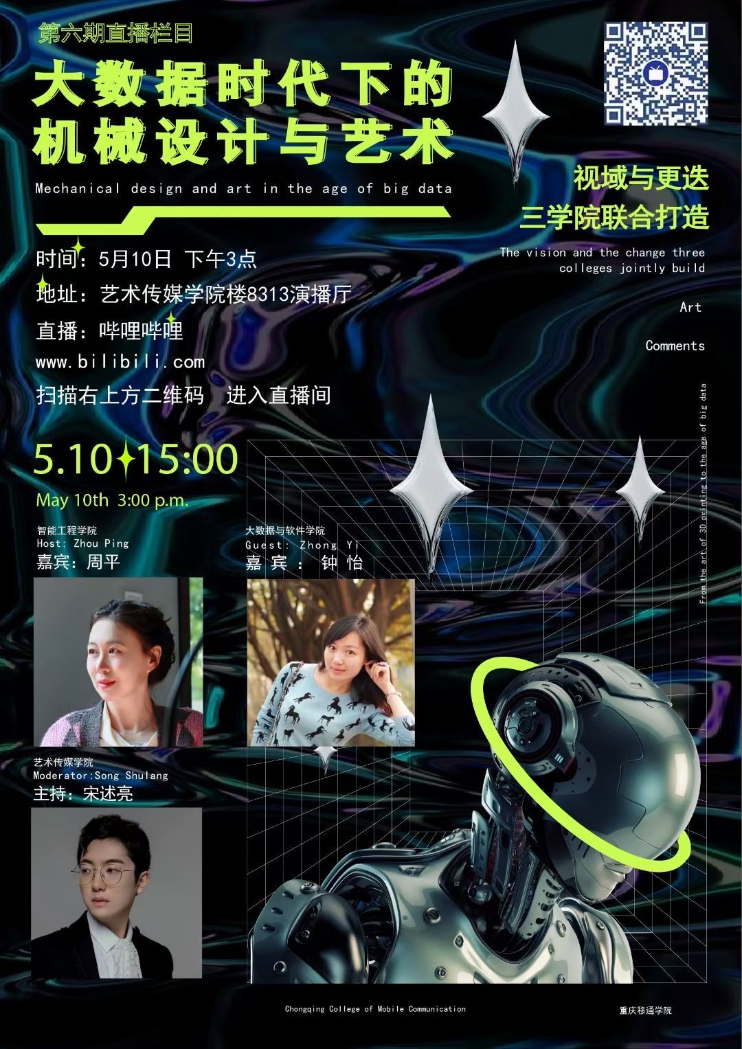 开展主题为“大数据时代下的机械设计与艺术”的访谈节目,于5月10日下午15点在演播厅8313拉开帷幕。将由智能工程学院机械工程专业的周平和大数据学院的数字媒体技术教研室主任钟怡担任特邀嘉宾,艺术传媒学院数字媒体艺术的宋述亮主持访谈。与会嘉宾将从大数据、机械设计、艺术等多个维度展开研讨,引领同学们感受科学技术与文化艺术的魅力。此次访谈节目采用了多元媒介的传播形式,以访谈节目结合时下青年受众热捧的哔哩哔哩网络直播,让同学们在观看的同时也提高了参与的互动性。