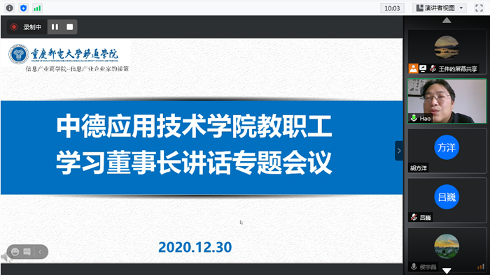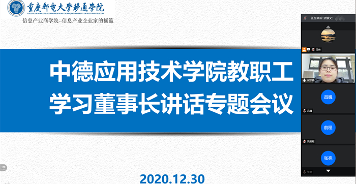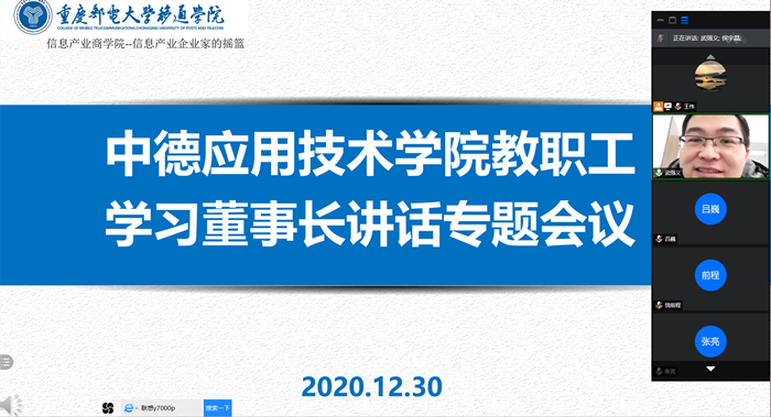 为传达并贯彻落实董事长彭鸿斌先生近日与集团三校商科教育、通识教育、名师课堂、创意写作团队及学校钓鱼城科幻中心全体教职工重要讲话精神,了解集团战略层面未来发展蓝图。12月30日下午,中德应用技术学院在线上开展“全院教职工学习董事长讲话专题会议”,在院长尹浩亮及副院长侯宇晶、武强义三位同志的带领下对董事长讲话精神进行深入学习。