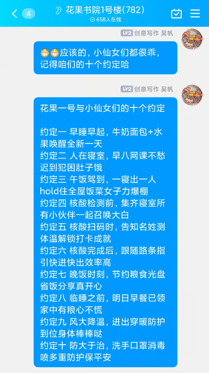 老师们利用云课堂与同学们保持紧密互动,宣讲抗疫知识,鼓舞士气,安抚学生们的情绪,随时关注学生的各种要求,并想方设法给予解决。全力保证每一位学生心态稳定,安心生活与学习。