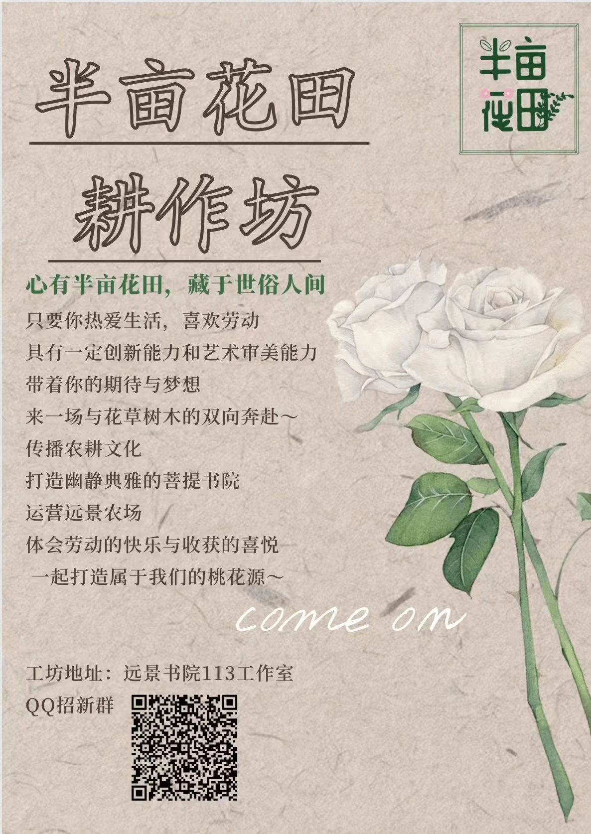 同时,远景书院半亩花田工坊基地的建成,欢迎来自全校热爱生活,喜欢劳动的同学加入“半亩花田”耕作坊!一场和花草的双向奔赴,一起打造治愈系家园!