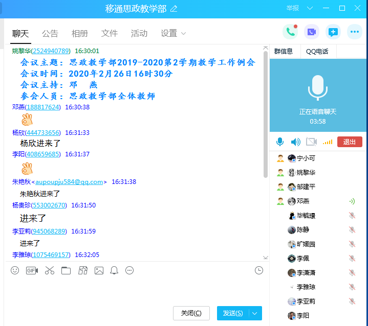 静默地等待是为了拥抱绚烂的春天!在全国人民众志成城、决战新冠肺炎的关键时刻,在“停课不停学”的特殊时期,虽然我们不能像以往一样,在三尺讲台挥洒自如,在敞亮的办公室辛勤工作,但是我们的心一直在一起,隔离病毒不隔爱。2月26日,下午16时30分,思政教学部通过QQ群线上交流的方式,“云上”进行了一次特殊的教学工作例会,会议由教学部主任邓燕主持,教学部全体教师参加。