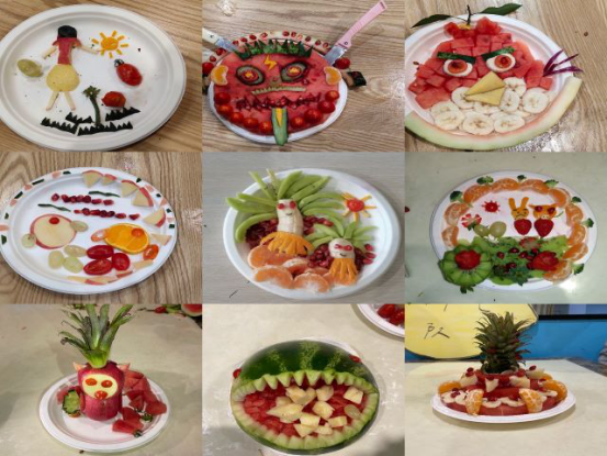 当三十个队伍全部到齐,美食文化节也正式拉开了序幕。现场气氛热烈,各队伍选好自己所需的水果,队员分工合作,开动自己的大脑,并进行去皮等步骤、精心制作成不同形状,将各种颜色拼凑摆放在一起,形成多个有趣的图案,有西瓜鲨鱼型,苹果猫头鹰等精彩作品纷纷呈现,参赛者们也热情高涨。
