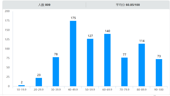 在本次活动中,共有809人参与,但遗憾的是其平均分仅仅只有60.85分(百分制),同学们的积极参与让我们看到了大家关于禁毒的重视,而较低平均分的背后让我们不禁寒颤,已是大学生的我们,对万恶毒品的了解也只是在及格线徘徊,而这也更加坚定了这场知识竞赛的活动意义:通过回答问题、知晓成绩的方式来警醒在校大学生,去了解更多的毒品知识是必要的,为禁毒成功埋下更多的希望是有利的。