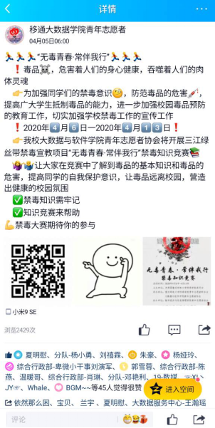 本次活动是针对移通全校师生开展的关于“禁毒知识知多少”的线上问卷调查活动,为确保此次活动开展的规范和顺利,校院两级同时在QQ、微博、微信公众号等平台进行前期宣传,并且联合2019级辅导员、组宣委员进行班级宣传,其中,空间推文累计转发26余人次,浏览量达4800余人次,并在20余个学生群中进行宣传,保证了活动的线上覆盖率。其次采用“题库” 形式,将相关的毒品、禁毒知识明了化,在同学们答题之前即可“饱览群书”,为自己的禁毒小屋添砖加瓦!