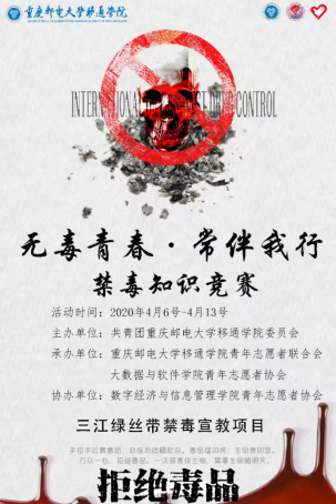 为深入贯彻实施《中华人民共和国禁毒法》、《重庆市禁毒条例》,认真落实禁毒工作责任制,加强校园毒品预防的教育工作,切实加强学校禁毒工作的宣传工作,由重庆邮电大学移通学院大数据与软件学院青年志愿者协会承办,重庆邮电大学移通学院学生处协办于4月6日-4月13日开展“无毒青春·常伴我行”禁毒知识竞赛。结合特殊时期形式,采用线上竞赛方式开展禁毒宣传教育活动。