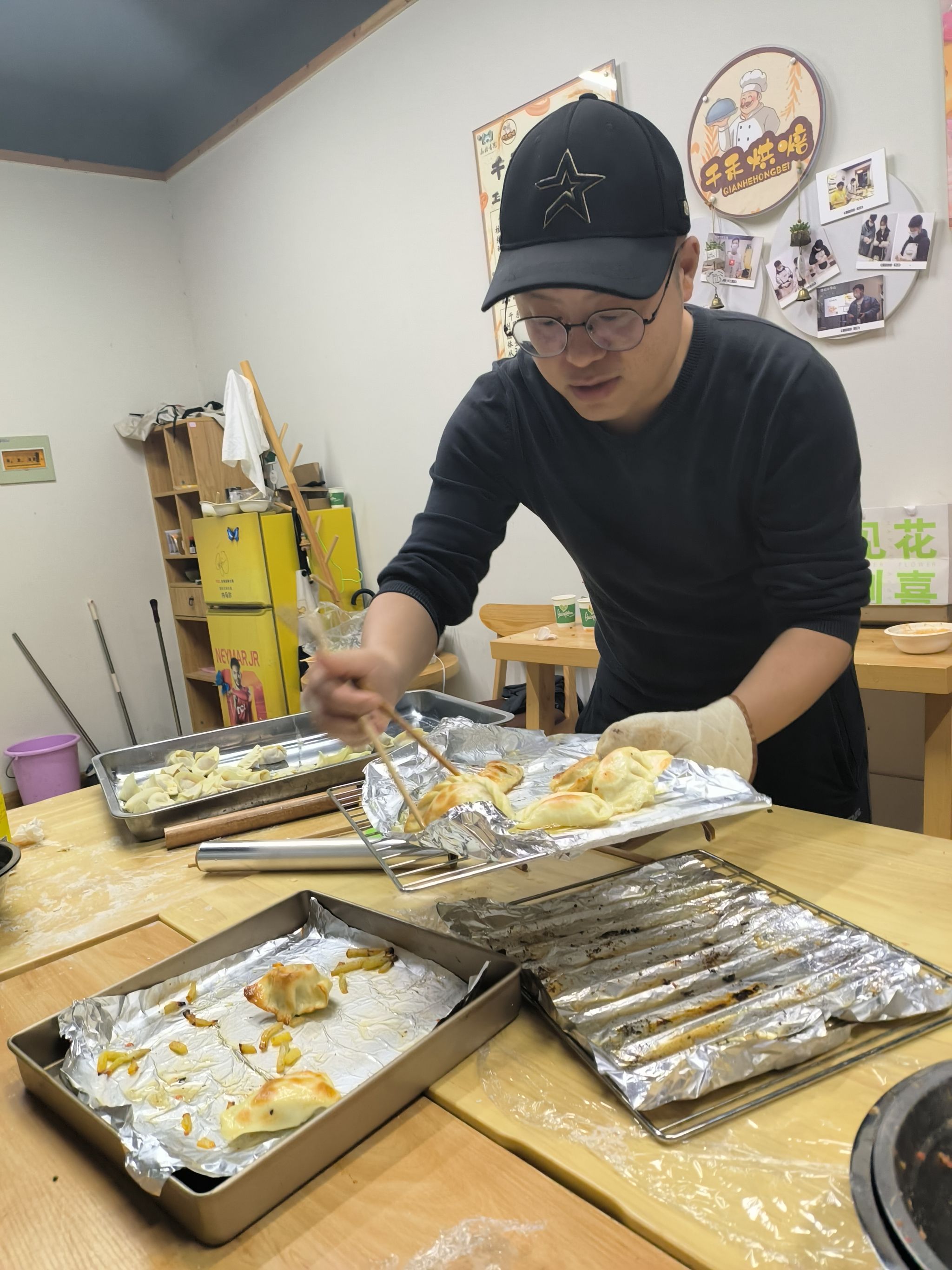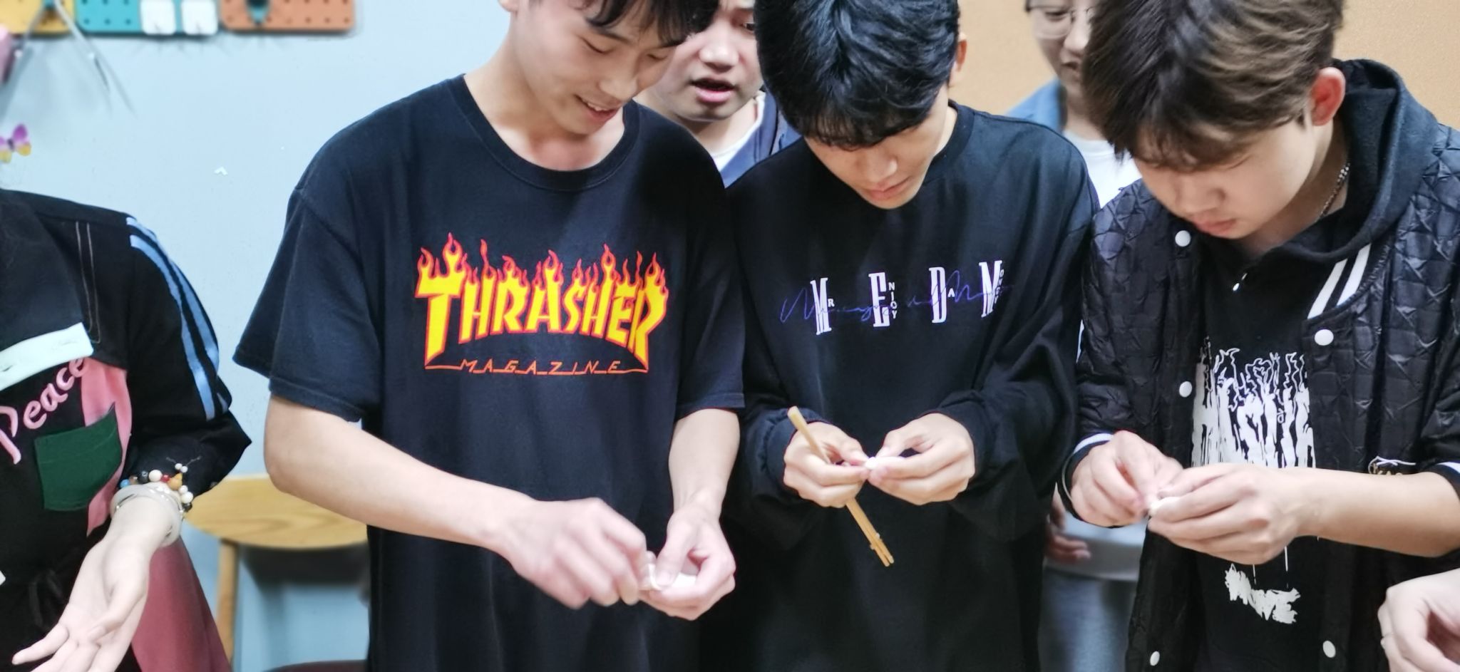 活动伊始,陆阳老师分别向同学们介绍了邓秋菊老师及她的异科组员,同时也让本小组的同学们做了自我介绍。通过大家的相互介绍、相互认识,活动的氛围渐渐熟络起来。于是,同学们自发的进行了分组分工。女同学负责清洗食材、餐具;男同学负责剁馅、和馅以及和面、擀皮。最后,大家一起来动手创造属于自己的“作品”。