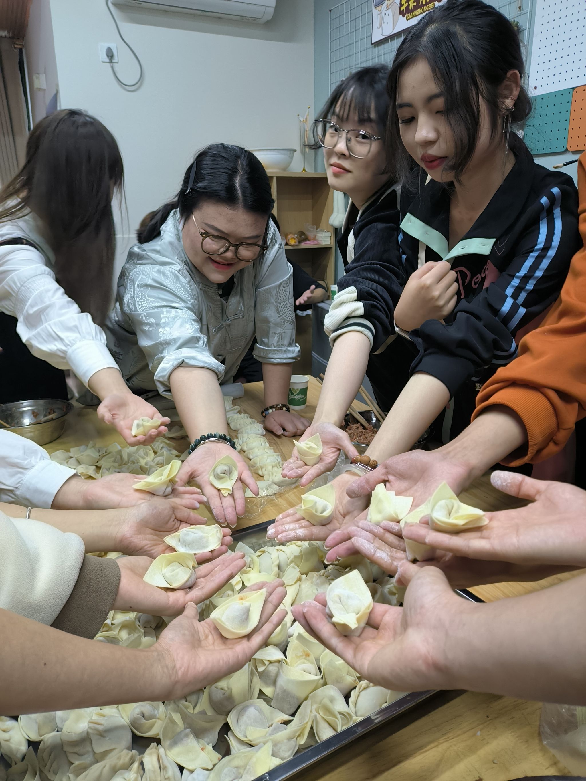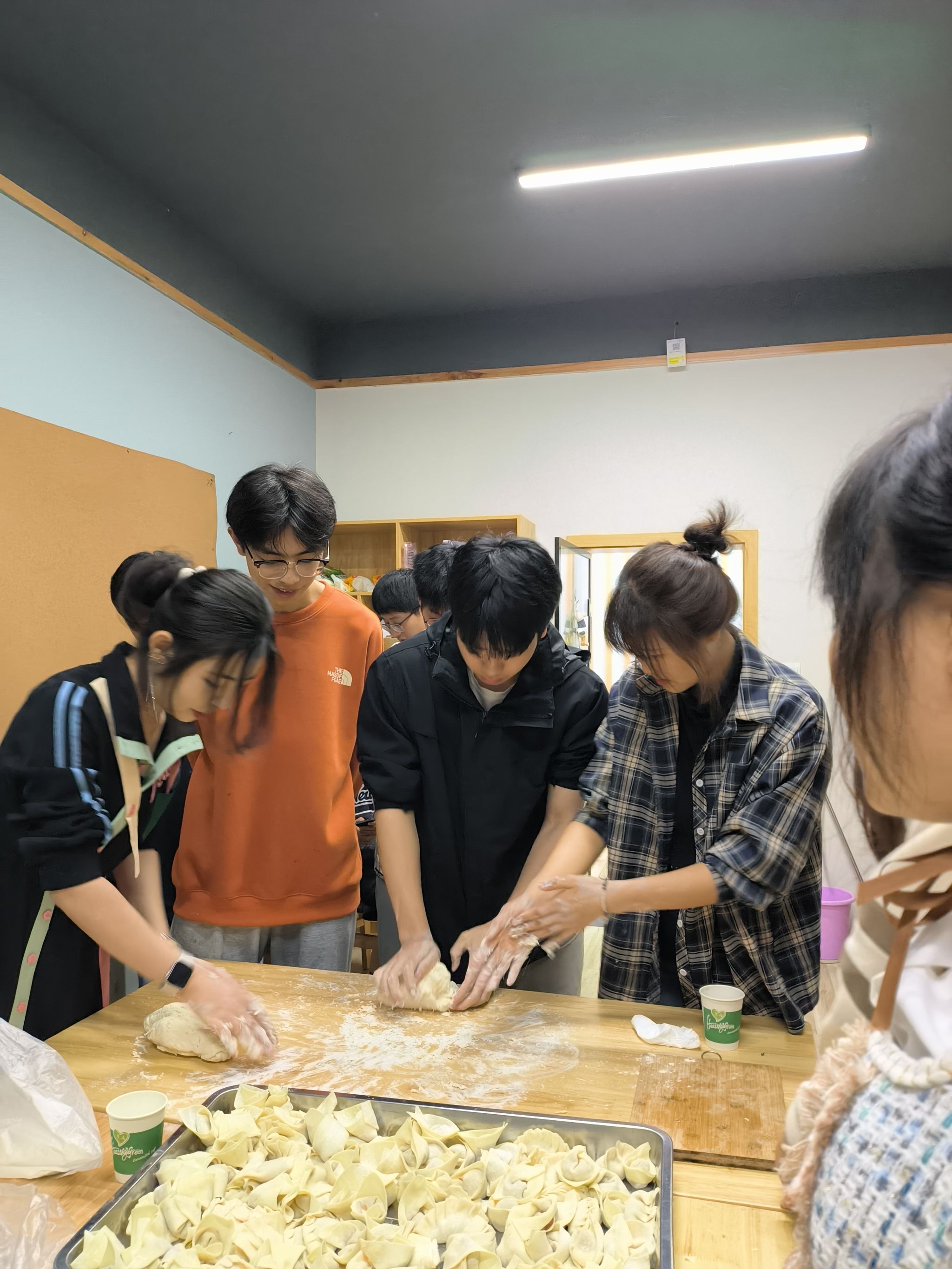在轻松、愉快的活动氛围中,大家都“八仙过海各显神通”,极力的展现自己。和面的同学认真的研究起面粉与水的比例,面粉既不能太干,也不能太浠,要软硬刚好;和馅的同学则积极的了解大家的口味,馅儿料既不能太淡,也不能太咸;擀皮的同学则卖力的把饺子皮尽力的擀到最薄,追求完美。同学们边劳动、边聊天,互相增进了认识,加深了解,同时也交到了新的朋友。她们开学的聊最近的学习,好玩的事情,讲到好笑的事情,大家则一起开心的大笑。在此过程中,同学们放松了自我,享受着这种快乐。随着时间的流逝,美味也新鲜出炉。大家看着自己的“手工作品”,迫不及待的掏出手机拍照,发朋友圈;然后相互的展示自己的劳动成果,相互品味着他人的“美味”,一起享受在“异”起的快乐。