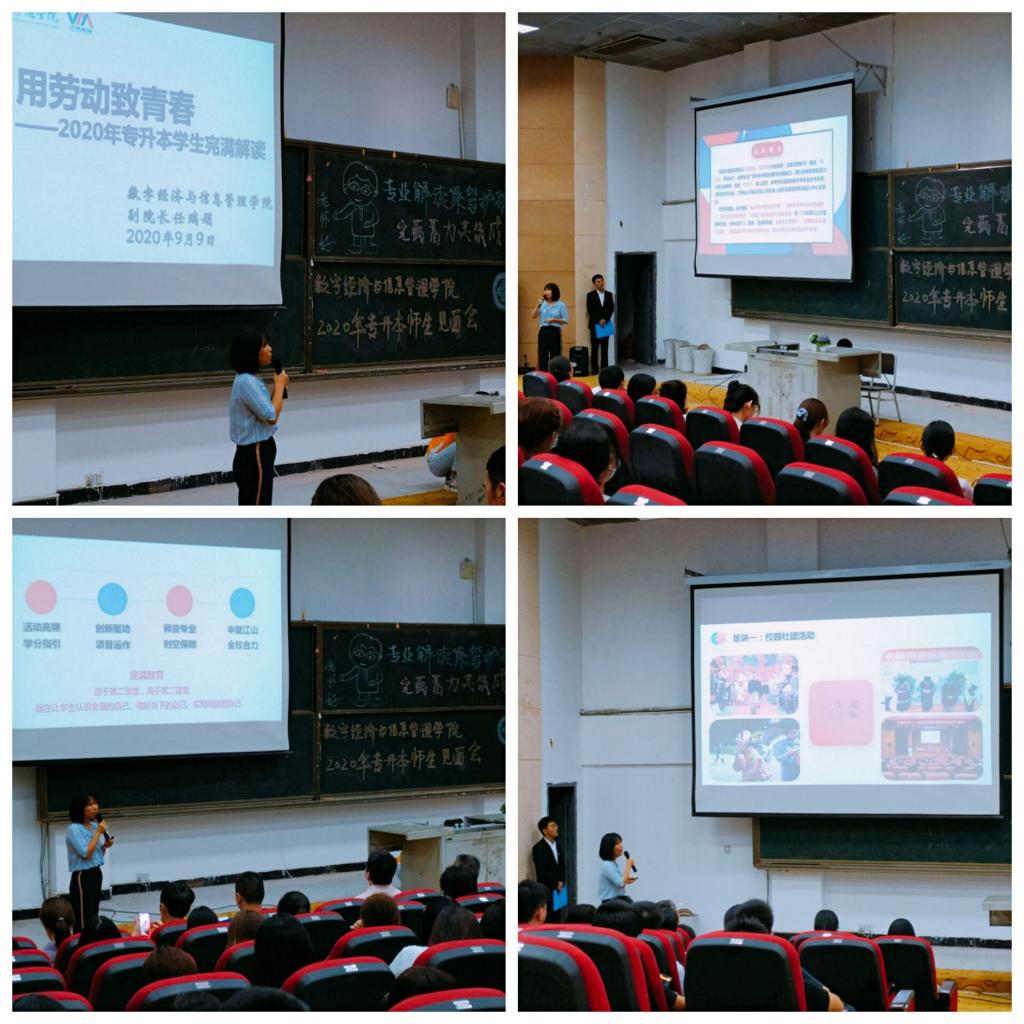 晚风吞噬了喧嚣,灯火斑斓了夜晚。为加强专升本新生与老师的交流与沟通,促进新生之间的情感,让新生们能够更好更快地融入到移通的学习生活中,数字经济与信息管理学院于9月9日下午16时以及16时30分,分别在3302教室和3303教室开展主题为“专业解读保驾护航 完满蓄力共筑成长”的专升本师生见面会。本次见面会邀请到数字经济与信息管理学院党总支书记、院长潘显兵教授、副院长刘贵荣教授,工程管理教研室主任周梦娇老师,信息管理教研室主任王哲老师,分管学生工作的副院长任瑞娟老师,学生工作办公室主任兼团总支书记廖阳老师,以及我院各年级辅导员及任课老师,为专升本新生解疑释惑,给予学习生活上的建议。