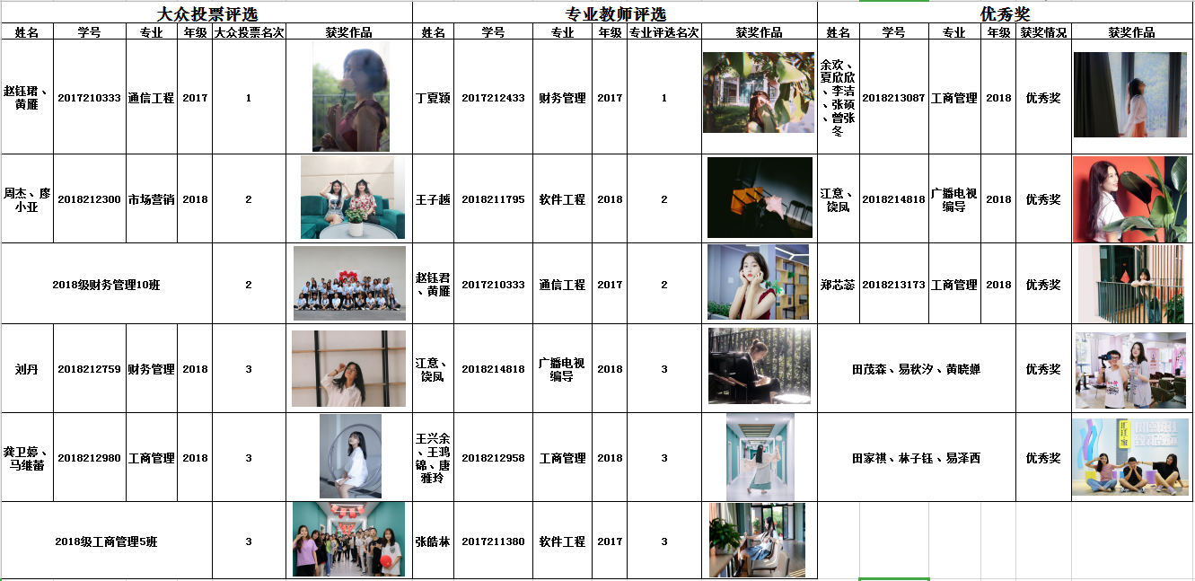 经过三天的现场投票以及艺术传媒学院广播电视编导专业朱其林老师和杨帆老师的认真评选,本次“我与书院的最美合影”摄影比赛秉着公平公正的原则,最终评选出专业组一等奖1名、二等奖2名、三等奖3名,人气组一等奖1名、二等奖2名、三等奖3名。此外,特增设了5名优秀奖以鼓励广大同学们积极参与的热情。