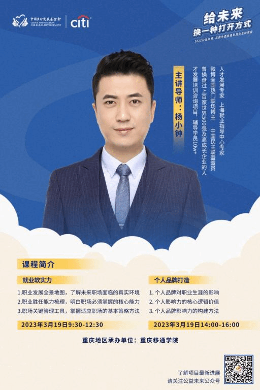 为让在校大学生深入了解新的就业环境形式,扩大对职场理论认知,以及对未来职业发展规划,寻找适合自己的职业领域,发挥自己的独特个人优势,抓住千载难逢的就业机会。重庆移通学院作为公益未来·中西部青年就业支持项目全国十所承办高校之一、重庆地区的唯一承办单位。由中国乡村发展基金会指导、校团委主办、青年志愿者联合会承办的公益未来·中西部青年就业支持项目沙龙活动于2023年3月19日在六度空间·大学生发展中心∞(无限)多功能厅成功开展。为大家破除就业迷茫,丰富自身阅历,志愿助力青年发展就业梦想,畅想公益创业未来!