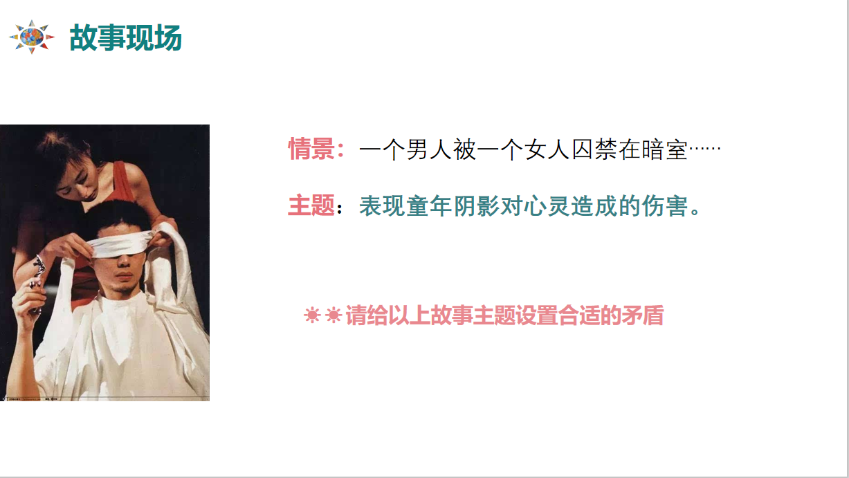 学完基本方法之后,最后吴老师给同学们带来了每堂课我们最期待的故事现场环节,这次的故事情景是“一个男人被一个女人囚禁在暗室”,老师要求构思的故事主题是:表现童年阴影对心灵造成的伤害。几位同学很快完成了故事创作,第一位同学写道:女主幼时被父亲当做赚钱工具,接待恋童癖的中年男人,长大后她囚禁了父亲,对外宣称父亲失踪而进行复仇,但最后,她那未曾泯灭的善良阻止了她内心的恶魔;第二位同学写道:女主小时候妈妈上班忙,为了她的安全,把她关在暗室。长大后她有了男朋友,她为了男朋友的安全,也喜欢把男朋友关在暗室,同样为了保护他。吴老师点评道:“同学们的故事设计很精彩,并且富有深度。我想告诉大家的是,朝你的故事开一枪并不难,设置矛盾有一百种方式,但最终你要选择什么样的矛盾进入你的故事,一定是与你故事的内容,所表达的主题,以及深度塑造一个富有层次感的人物有关。好的故事千人千面,有多重解读,就像矛盾从来不是单一存在,这便是矛盾的魅力所在。这也是今天我要分享给大家的全部内容。”