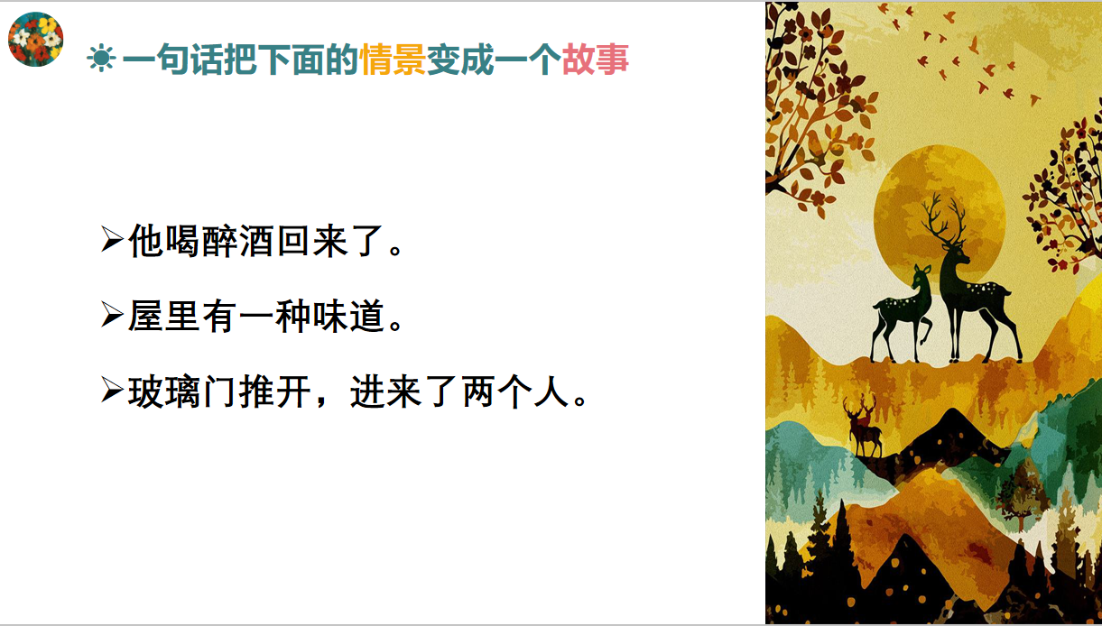 听完陶慧娜同学的分享,大家都对矛盾有了初步理解,接下来吴老师给同学们准备了一个小游戏:一句话把一个情景变成一个故事。“他喝醉酒回来了”,用这句话做引子,激发同学们的故事创作欲。大家给出的“故事”也精彩纷呈,脑洞大开,比如: