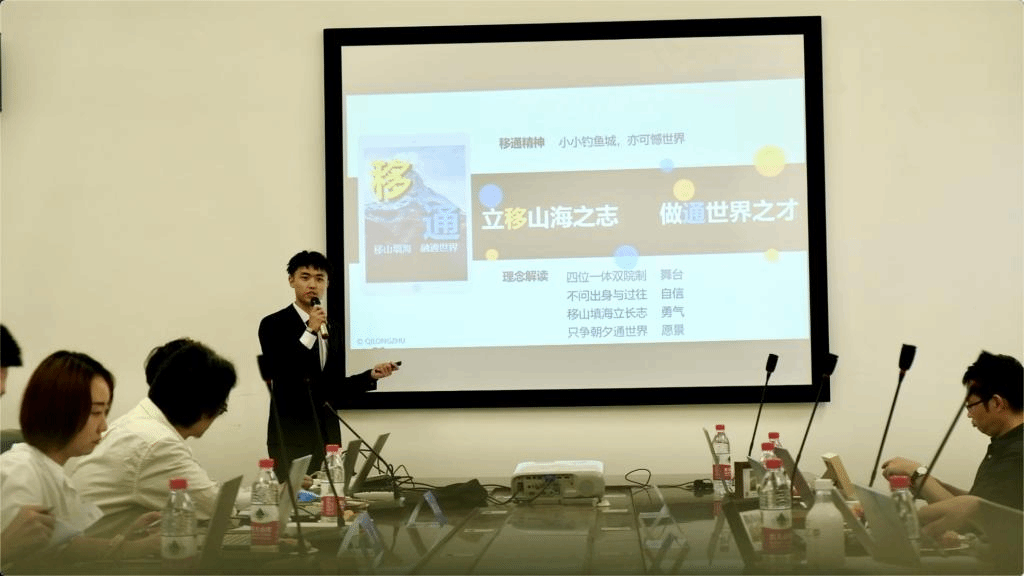 本次大赛旨在加深全校师生对我校办学理念、办学定位、培养模式的理解,以学生的视角发现学校的特色和亮点,鼓励学生激发创新意识,将自身所学应用于实践,助力宣传学校品牌,切实培养自身的策划能力、文案设计及组织推广能力,进一步增强市场意识、品牌意识、团队意识以及对学校的认同及热爱。《移山海,通世界》这件作品正是在认真领会学校办学理念与定位、积极响应大赛宗旨的基础上,经过两个月的认真拍摄与剪辑,精心制作而成。作品挑选了移通学院里的一天,以小诗为画面串联,力图在时空对话时、光影交错间,展现出移通学子们丰富多彩、青春活力的校园生活,也展现出他们在“四位一体双院制”模式下,“立移山海之志、做通世界之才”的逐梦过程。“立移山海之志,做通世界之才”是本件作品的主魂,“移”和“通”正合移通学院的“移通”二字。作品对移通精神的诠释是:小小钓鱼城,亦可憾世界。移通学院位于合川这座影响了欧亚大历史的文化名城,天然浸染了合川人民抗争不屈、敢于挑战命运的精神,而学校竭力打造的“四位一体双院制”,为社会提供了立长志、铸高才的舞台,学子无需问出身、也不用究过往,即便处于小小的方寸间,也可立移山填海之志,只要努力拼搏,经过日复一日看似普通的打磨与淬炼,完全可以成为达己济人,能沟通、联通并最终融通世界的人才!作品中数学与英语的课堂分别象征科学与人文,琴弦与播音代表未来与世界,舞台即为四位一体与双院制,球场上飞扬着的是拼搏精神,书院中体现的是不负青春!其中,提示字幕中,完满、技专、通达、博观分别对应完满教育、专业教育、商科教育和通识教育等“四位”;作品结尾处“A brave new life starts again”,则借用了英国作家莎士比亚的戏剧《暴风雨》中的“a brave new world”这句话,“brave”一词既含有原文中wonderful 的意思,象征美好与精彩,也饱含“brave”本身的勇敢之意,象征努力拼搏。作品意在传达,移通学院作为一个美丽新世界,学子到来以后,迎接他们的必将是新的生活与美好的未来。