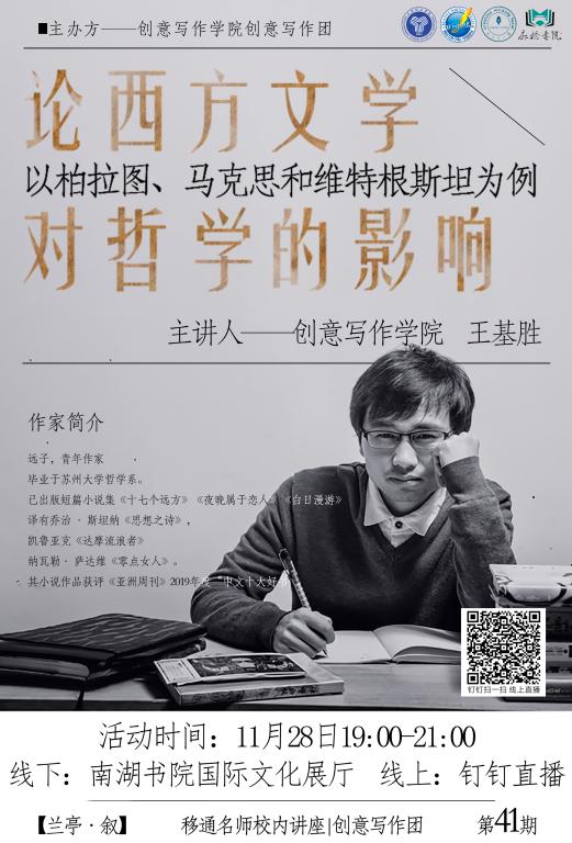 在这宁静的冬夜,迎着微寒的风,我们走在前往南湖书院的路上,去参加由名师讲堂移通校内讲座与创意写作学院创意写作团共同举办的第41期“兰亭·叙”文化讲座。带着理想和问题而来,我们再次聚集,是对文学的渴望和对哲学的探寻,如同大海对于溪流的召唤。
