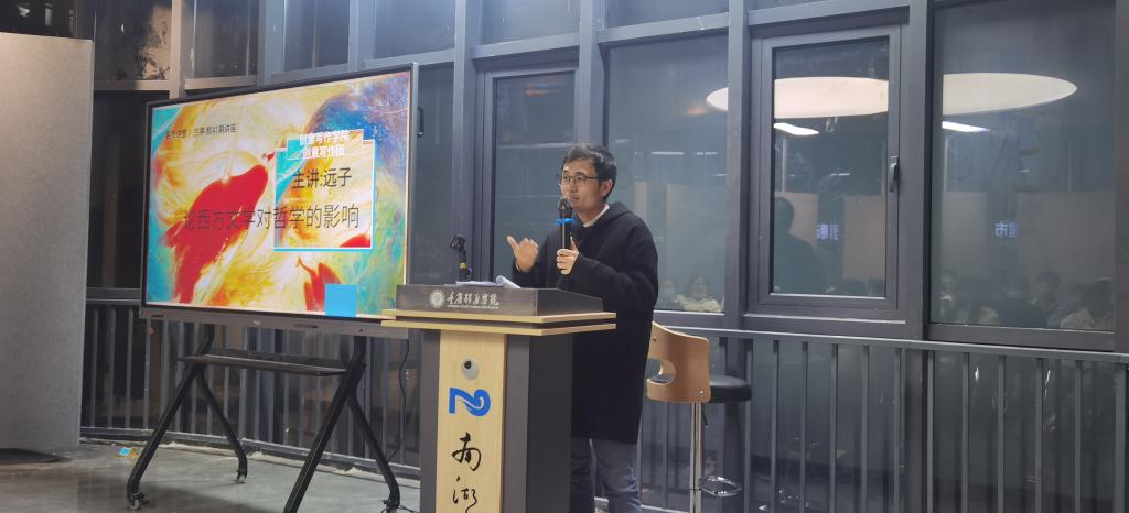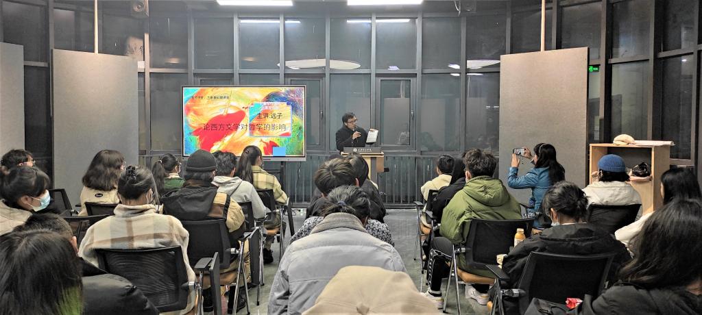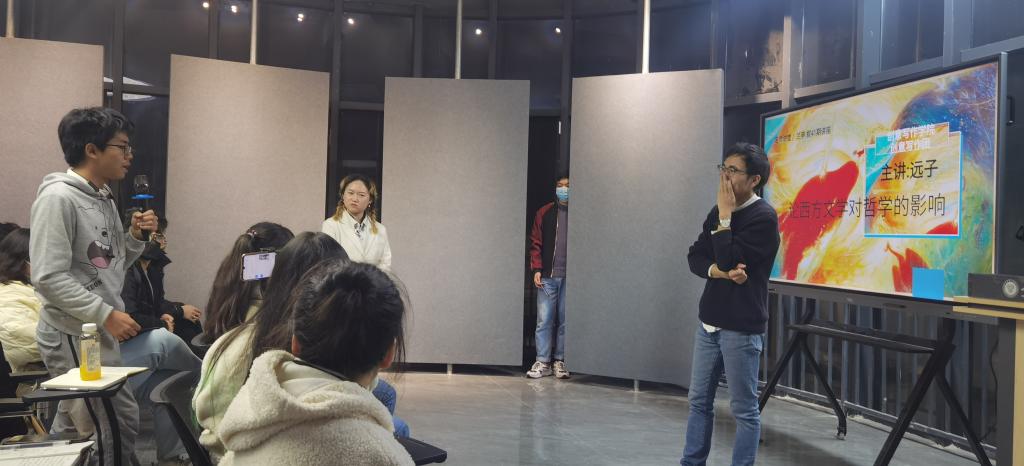 2021年11月28日晚上19:00,文化讲座《论西方文学对哲学的影响——以柏拉图、马克思和维特根斯坦为例》在主持人创意写作团团长赵闯的介绍中拉开帷幕,参加此次活动的有创意写作学院青年教师韦怡然、王碧嫦、杨玥、刘梅舒及创意写作团的指导老师、作家毕然老师。