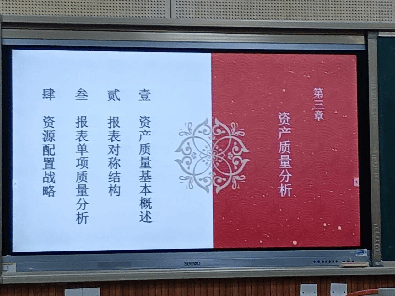 作为多次评为远景百万杰出教师和特级教师,张丹丹老师一开场就展示了深厚的教学功底。以中国风的PPT样式列出本次示范课的主题资产质量分析以及四个板块内容,分别是资产质量基本概述,报表对称结构,报表单项质量分析,资源配置战略。