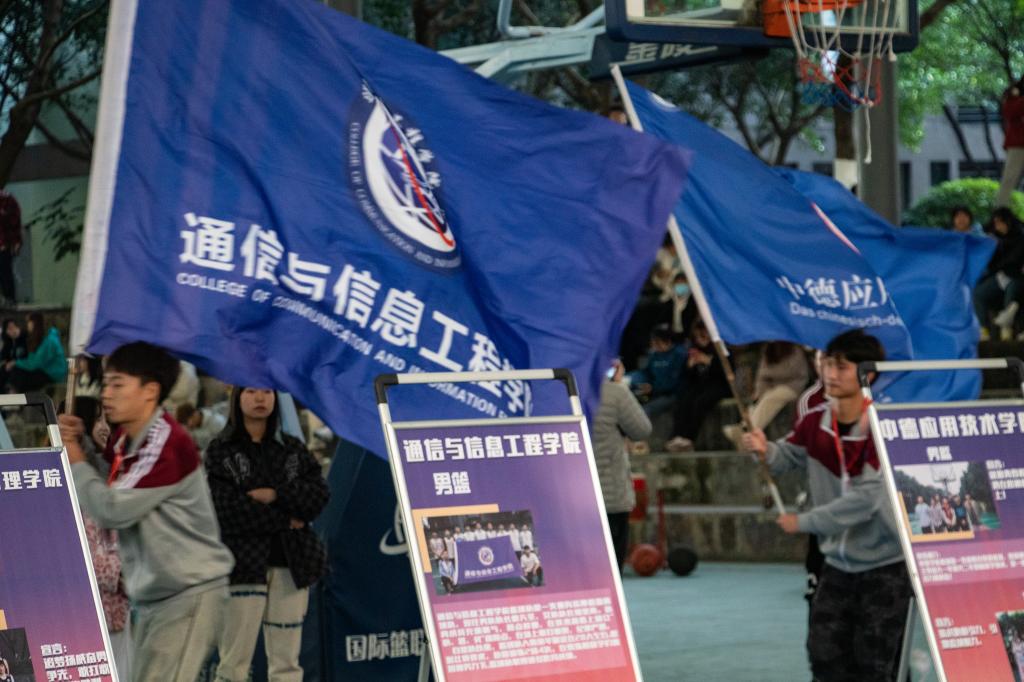 活动伊始,随着音乐声响起,在主持人张雨佳、陈岭的宣布下,九大学院院旗在持旗手中环绕活动现场一周,飘扬在空中的院旗,同样彰显的各个学院的青春活力,2021-2022学年“阳光杯”系列篮球赛事开幕式也随之正式拉开帷幕。