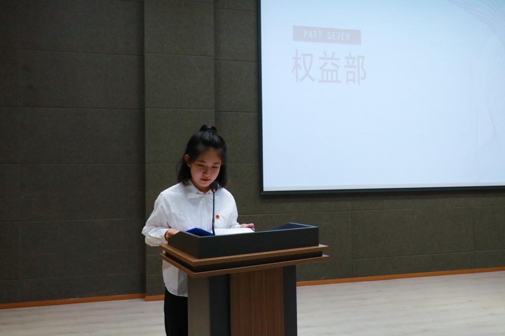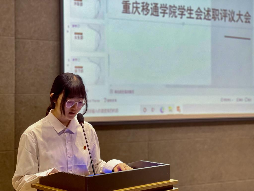 首先由第六届学生会主席团成员进行述职。学生会执行主席刘欣怡以“不止步、不受缚、不被定义”为主题,以自身角度出发开展学生工作开启大会述职,以推动学生会机制改革、着力提升学分解读、创新完满教育特色品牌活动为重点;学生会主席团成员谭佳本次述职的主题为“我与完满的996故事”,以打造特色权益服务体系、举办精品“女生学堂”、全心全意做同学服务者为核心;学生会主席团成员陈熊源本次述职的主题为“所有的伟大都源于一个勇敢的开始”,从青马工程、“外引内联”三个跨越、“除锈+引进”、未来展望等方面进行总结,整个主席团都在原有工作上面做加法。