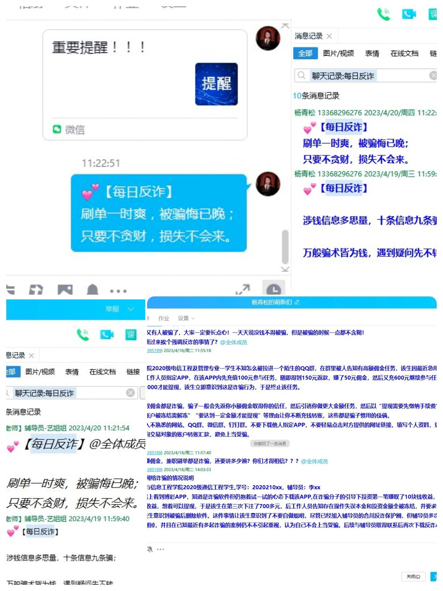 为增强学生的防骗意识,提高识别应对各种诈骗手段,保障自身利益,维护校园净土,通信与信息工程学院通过“反诈主题班会”“年级群转发案例”“反诈主题查寝”“签署反诈承诺书”“辅导员跟预警学生谈心谈话”以及“每日反诈提醒”等一系列宣传手段全方位对学生进行反诈宣讲。