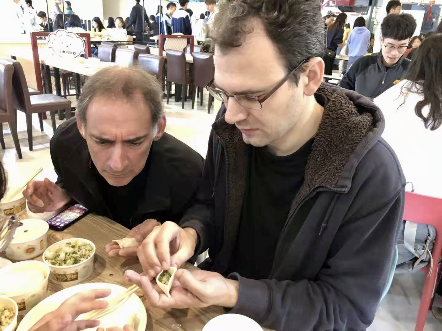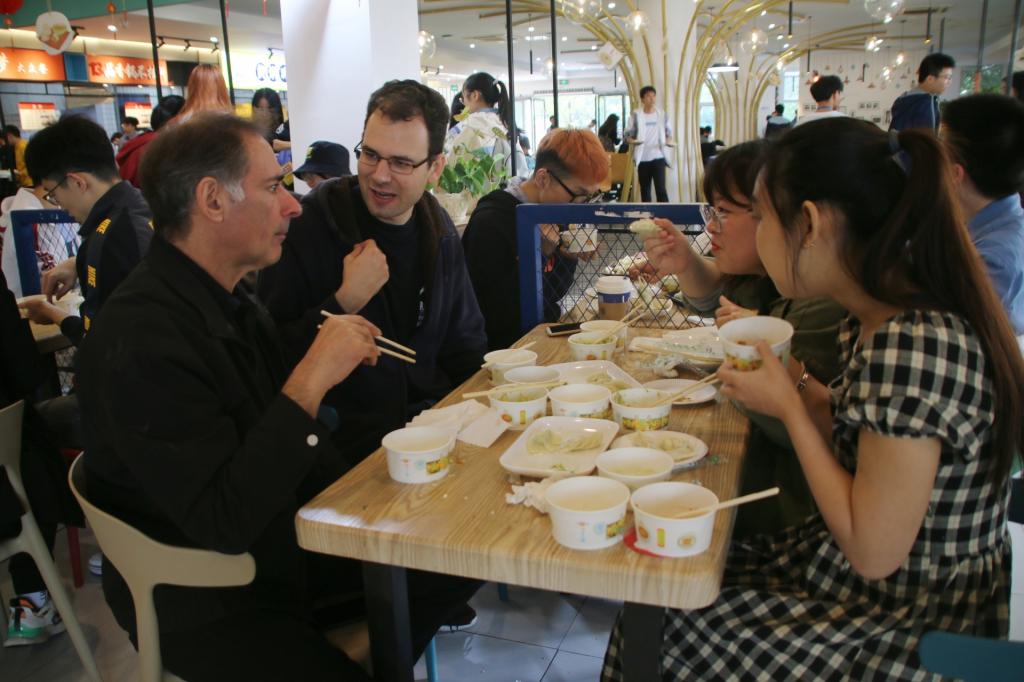 On Saturday we attended a dumpling-making and cooking festival in the Yitong canteen. When I entered the canteen I was impressed by the slick organisation of the areas and tables which were designated for the event. This also included the many student workers who were on-hand to help and direct to ensure everything went well.When I saw the huge steel bowl full of onion, lettuce, cabbage and meat being mixed by hand I knew we were in for a real treat of dumpling mania! I was fortunate to be taught to make the dumplings and aided by wonderful and so-talented students.Everything, from the two hosts, the teaching video, the students and the great atmosphere served to make this deightful event very special!! Thank you everyone!!
