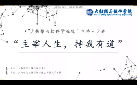 通往罗马的道路虽有千万条,但可以主宰的只有自己的人生路。为了丰富同学们的疫情生活,创设一个锻炼和展示自己的舞台,2020年的校园主持人大赛以别样的方式如期而至。4月3日18:00,“主宰人生,持我有道”大数据与软件学院线上主持人大赛的初赛正式启动,风华正茂的选手们在这个舞台挥洒汗水,燃烧青春,用话筒挥斥方遒,展开了一场才智的较量,自信与勇敢的比拼;传递着他们自己的情感与故事;展示了属于他们的青春与魅力。
