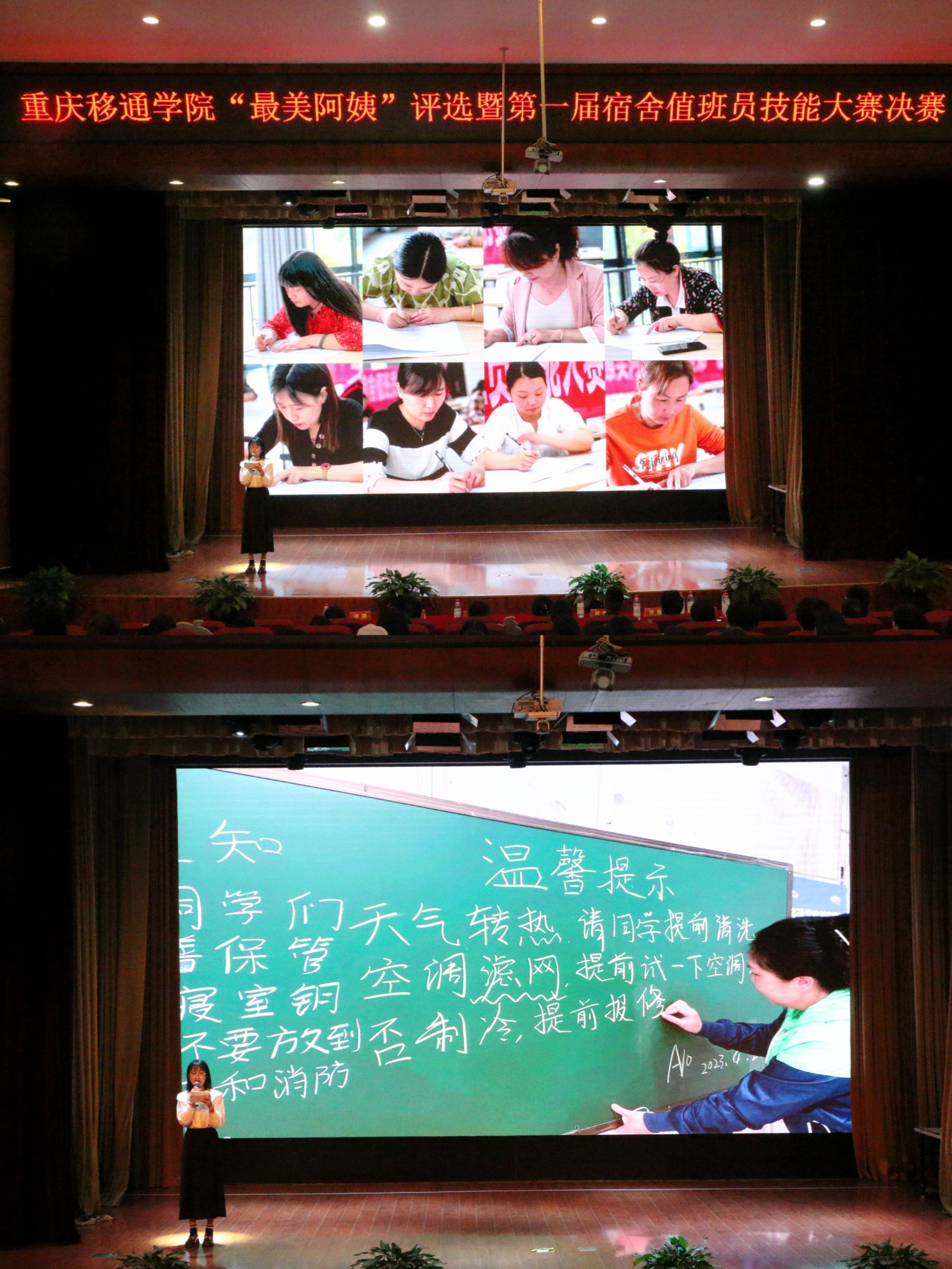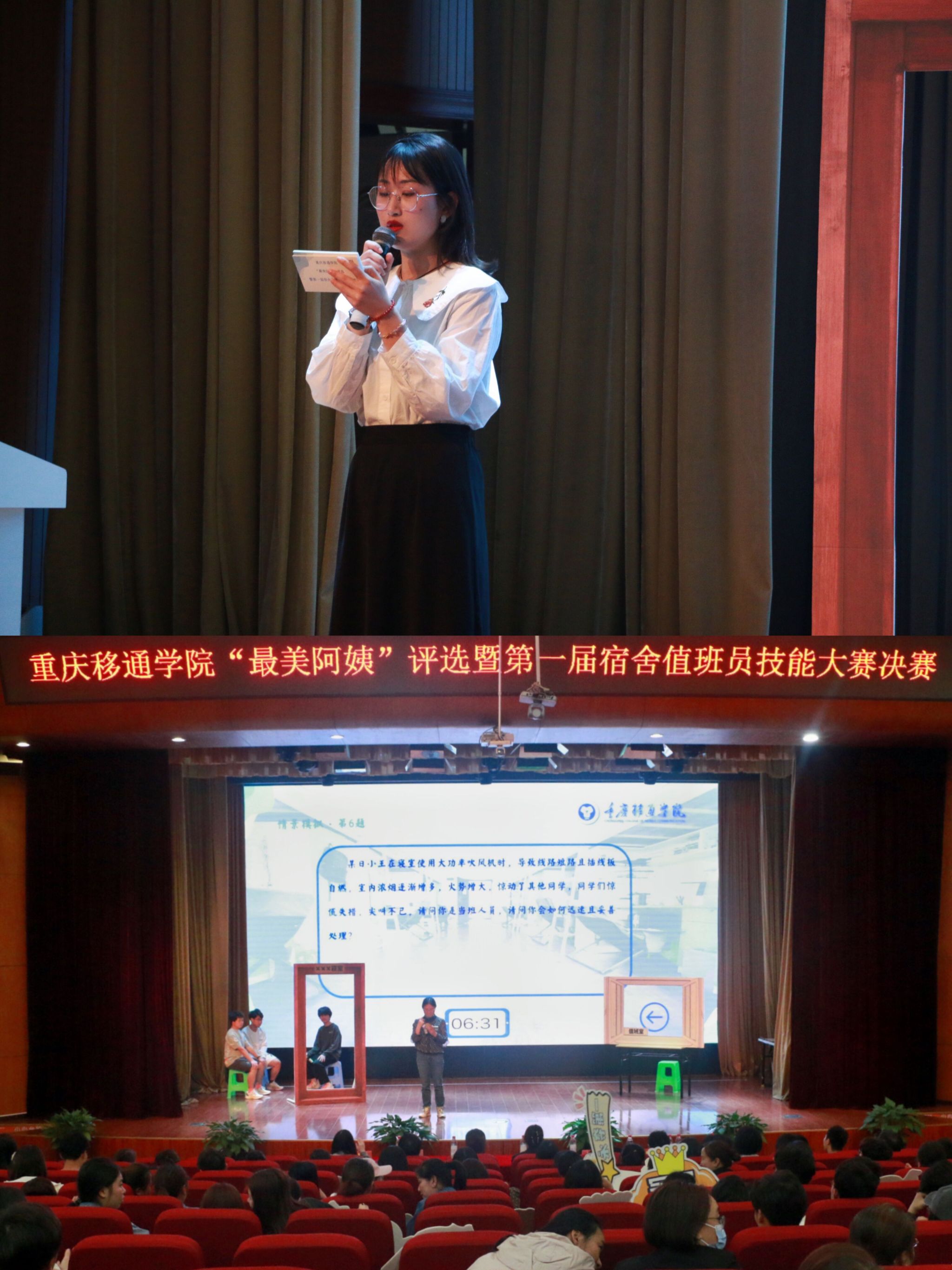 为进一步提升学生宿舍服务水平,思想上提高宿舍值班员的服务意识和敬业精神,能力上促进宿舍值班员对岗位工作技能的学习与掌握,4月26日下午,由学生处、书院部主办,学生处宿舍管理中心承办,人力资源处、重庆新商科教育信息咨询服务有限公司协办的“最美阿姨”评选暨第一届宿舍值班员技能大赛决赛在下里巴人剧场顺利举行。大赛邀请到重庆新商科教育信息咨询服务有限公司、人力资源处、基建后勤处、书院部、保卫处、学生处、校级学生会的各位老师和同学担任本次决赛评委,特邀学生处陈帅处长参加,学生处宿舍管理中心文璐祺老师主持本次决赛。