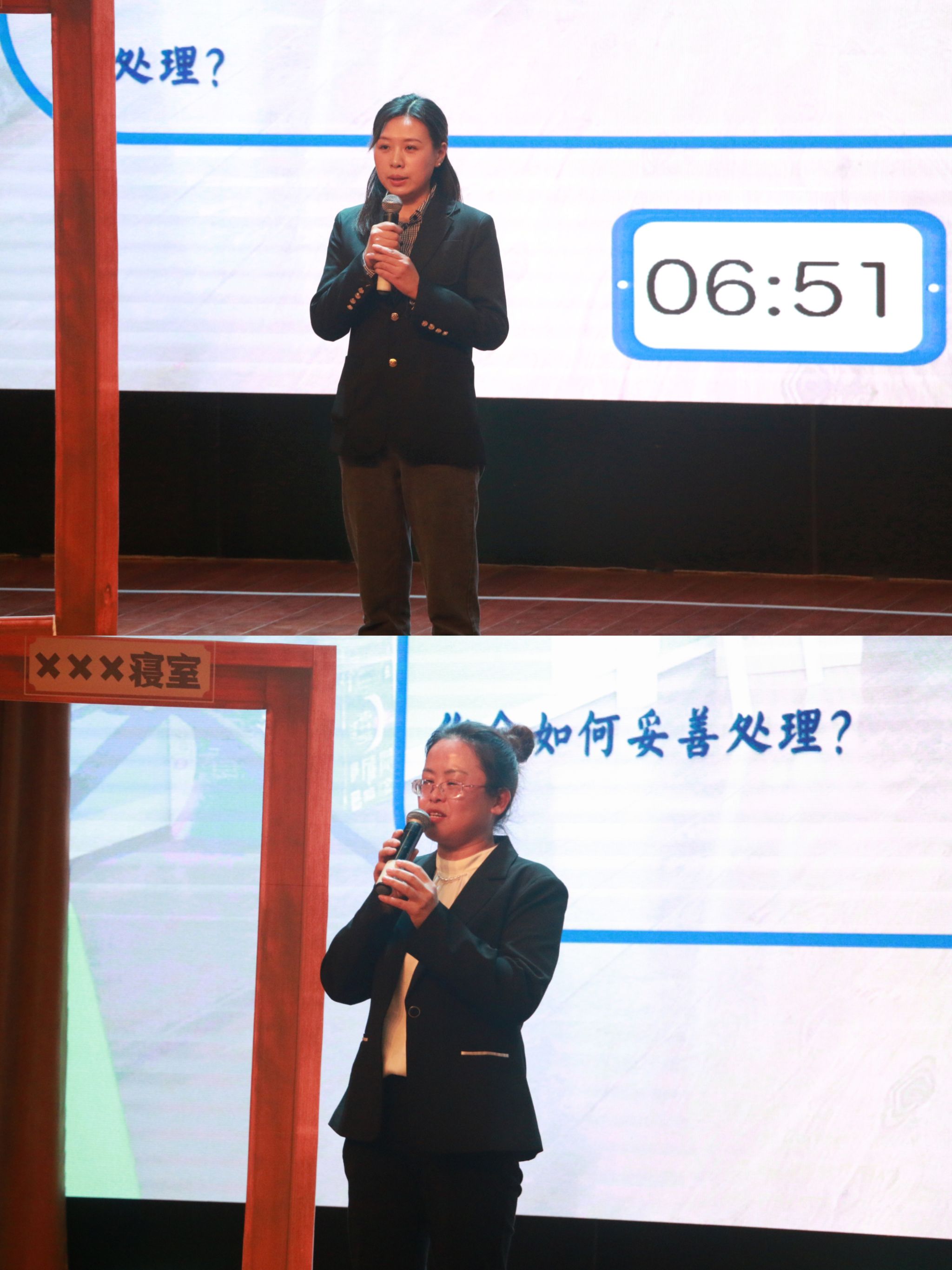 自我阐述后,值班员渐入佳境,面对打架斗殴、突发疾病、受伤、醉酒、寝室矛盾等问题,冷静思考,沉着应对,凭借多年的工作经验与过硬的工作技能从解决思路、实施方法等方面入手,展现了在真实情景下正确有效的处理方式。体现了宿舍值班员们对岗位职责的熟悉程度,展现了较高的职业素养。