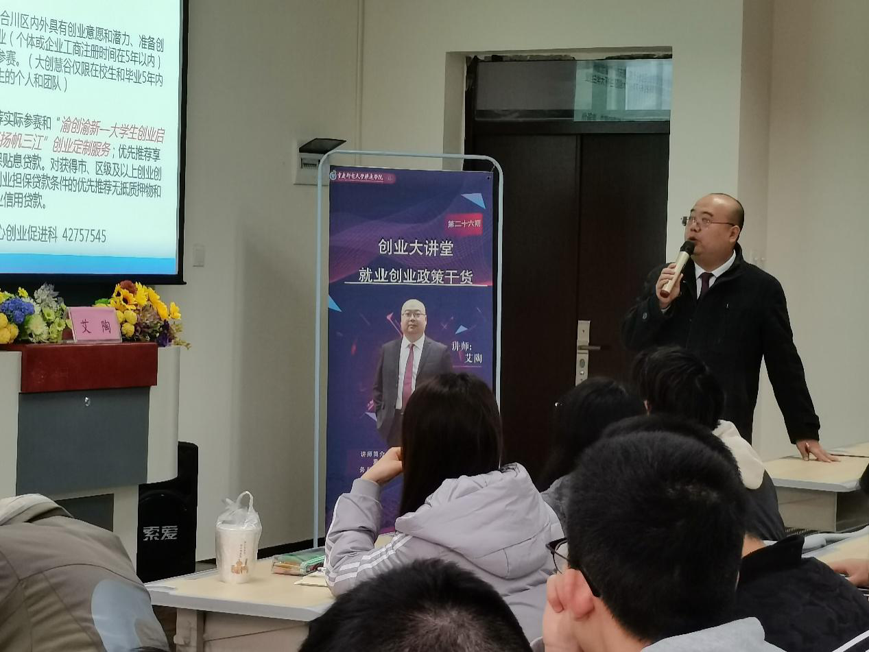 然后,就创业篇而言,艾陶老师详细讲解了创业培训、创业担保贷款、重点群体一次性创业补助、免费创业工位等一系列创业扶持政策介绍了创业担保贷款流程;他通过列举创新创业大赛、渝创渝新、大创慧谷、“优创优帮扬帆三江”创业项目定制服务等创业创新活动提高了同学们的积极性,加强了同学们对就业创业政策的认识。