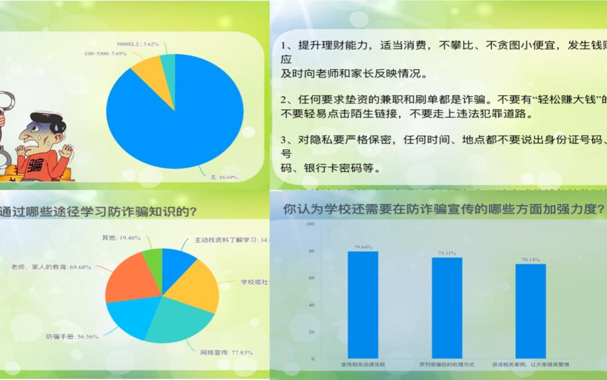 会议前期,为更好了解和掌握同学们目前的防诈骗意识和被诈骗的具体状况,基于实际的数据调查,对同学们展开系统研究,通过发放大学生防诈骗调查问卷方式展开工作,根据收集的数据显示,同学们的防诈骗意识还有待加强。此外,同学们对于学校如何加强防诈骗宣传力度也给出了相应的建议,其中包括“宣传相关法律法规;罗列受骗后的处理方式;讲述相关案例,让大家提高警惕”等。