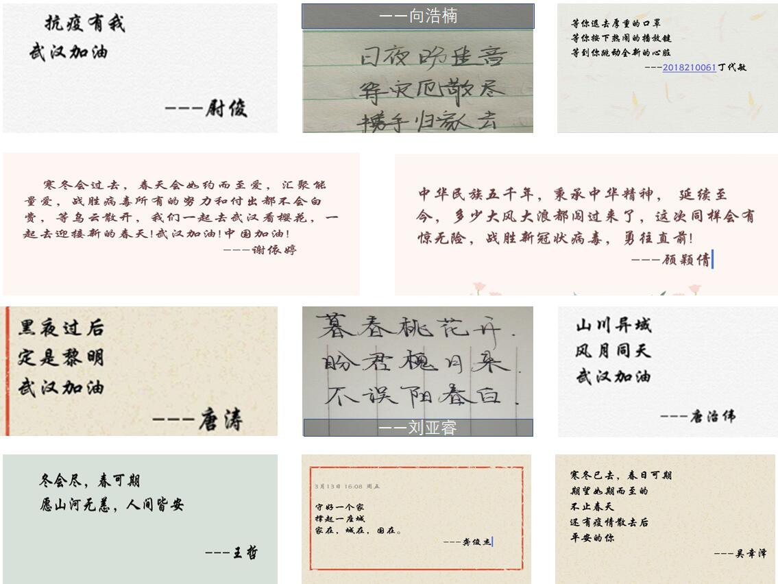 武汉加油,湖北加油,中国加油,18级通信工程2班的同学写下的一字一句体现着同学们对时事的关注,对同胞的担忧,对医护人员的尊敬,更是写下美好祝愿,等待胜利的来临!