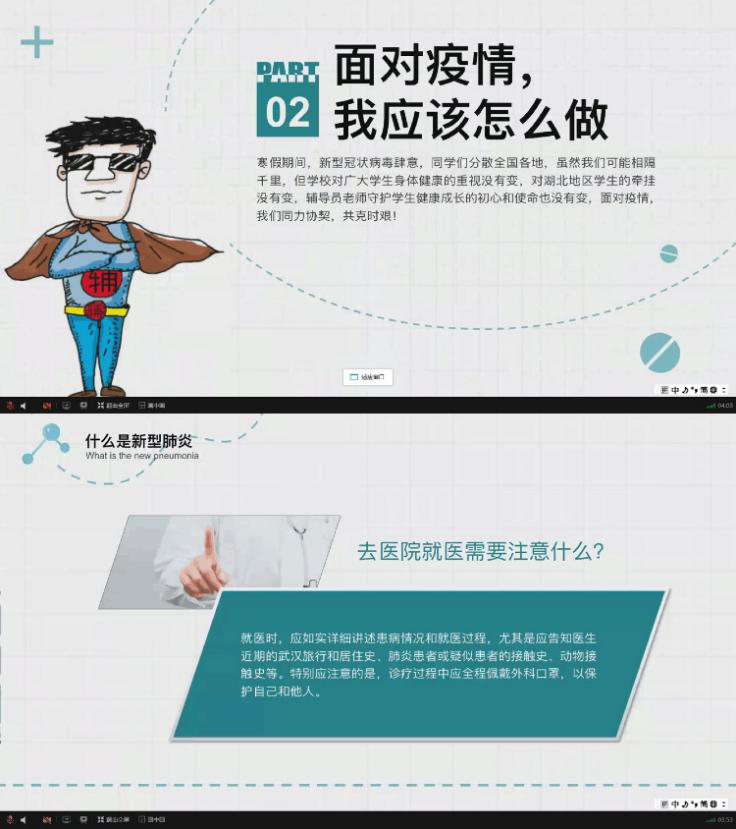 就是在这样的情况下2019级通信工程21班的同学们组织了关于“疫情防控”的主题班会,让同学们认识什么是新型冠状病毒?面对疫情,我们该怎么办?疫情之下我们看见了什么?疫情过后,你还应该学会什么?防疫不仅是防病毒,也要防止‘懒癌’五个问题,希望同学们提高自制力,不做低头族。面对此次疫情作为00后的大家,我们真诚的希望大家收获到:爱国,感恩,奋斗,担当。