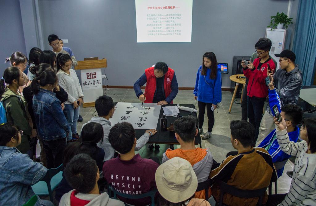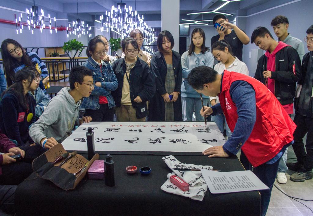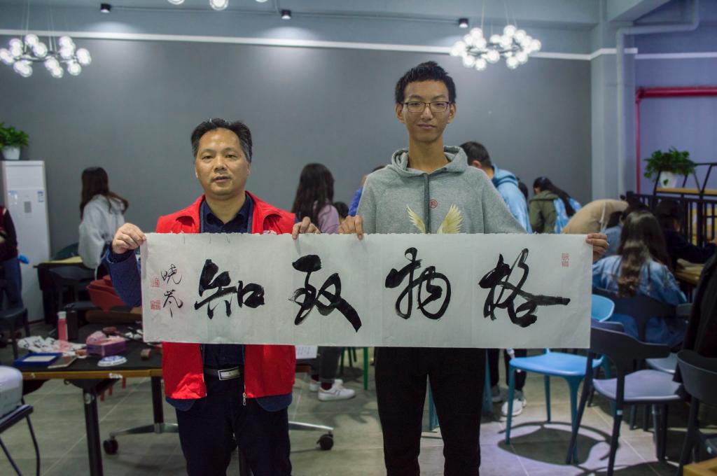 除了理论的分享,实践必不可少,为了加强同学们的学习印象,兰老师亲自提笔示范,现场为大家撰写了部分代表楹联作品。内容围绕学习方法、人生态度、中国文化等主题,并将作品赠送给了现场参与者。参与者张坤同学说道,他将会珍藏兰老师赠送的珍贵作品,并积极参加后期的书法研习。
