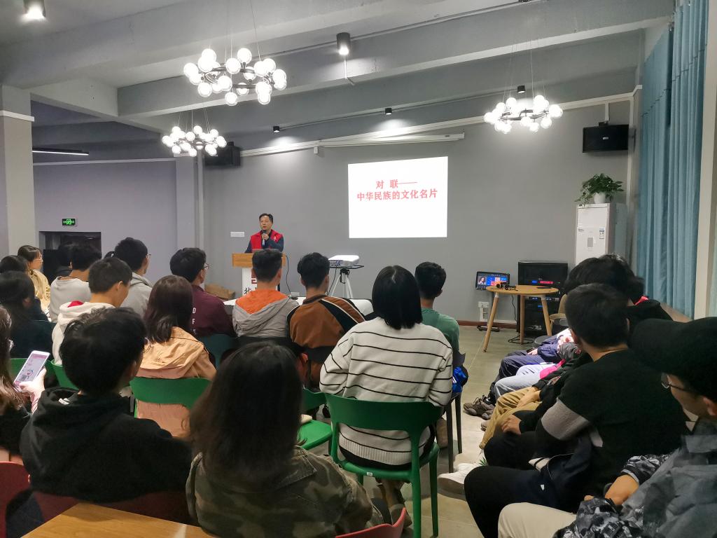 兰老师分享到,楹联是中国优秀传统文化的重要一部分,其有着严格的对仗要求,讲究字数相等、词性相对、平仄协调、意义相连,但却不失活泼,具有十分灵活和强大的表现力,是一字一音的中华语言独特的艺术形式。学习楹联不但能丰富课余时间,提升自身内涵,更能深入了解中国传统文化,助推传统文化的发展。现场的同学们聚精会神,认真倾听,在楹联文化的世界遨游。
