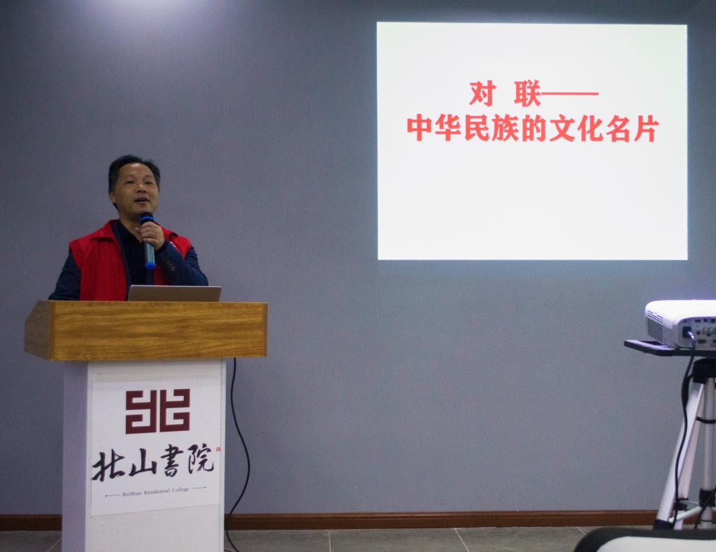 11月1日,合川区楹联教育基地、校传统文化学生社团联盟于北山书院会客厅开展了以“对联·中华民族的文化名片”为主题的首期书法沙龙分享会。由合川区楹联学会会长兰梦宁老师主讲,带领学生领略楹联文化的艺术魅力。