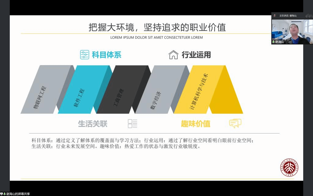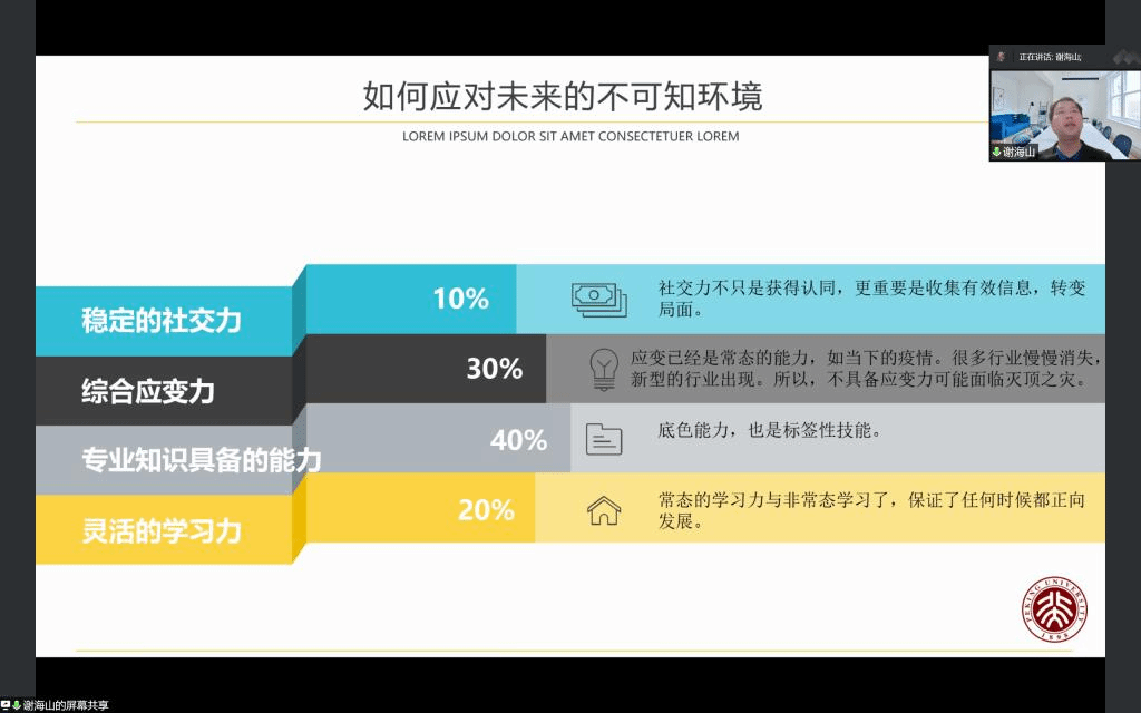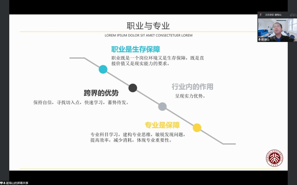 为解答同学们在深造学习、求职创业上的困惑,引导学生合理制定自身未来职业规划。结合53.62%花果书院学生均为临近毕业的现状,花果书院名誉院长谢海山院长于2022年4月27日14:30在腾讯会议开展以“职业规划:考研与就业指导”为主题的院长公开课,围绕“专业与职业”、“个人成长发展”、“职业价值”等话题,帮助同学们了解考研与就业的相关知识,明晰社会职业需求。同时引导同学们从四重维度能力着手,即专业能力、应变力、社交力、学习力,增加自身综合竞争能力,以不破不立之姿迎接挑战,在日积月累中成长为有责任有魅力的新青年。