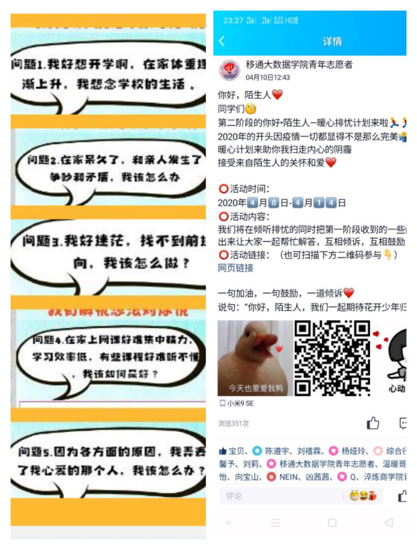 此前,“暖心排忧”第一阶段的成功举办,吸引到更多的同学愿意去了解“你好,陌生人——暖心排忧计划”活动,“暖心排忧”第二阶段通过官方QQ、微信公众号平台以及各个辅导员的大力宣传下,活动成功开展,效果显著,参与人数增加到550余人,举办方不仅仅用一串串精心打磨的文字来回答同学们的问题,还会向他们提出五个热度最高的问题,如“线上教学,学习效率底下,我该如何做”“在家和父母产生矛盾,该怎么化解”等,回答人数突破两千,这两千种的回答中,蕴藏着两千种心绪。