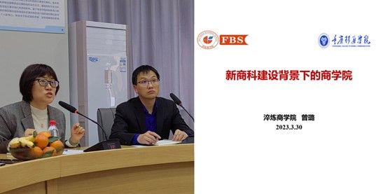 两个学院的领导分别介绍了主要的参会人员后,淬炼商学院副院长曾璐首先就我校新商科背景下商学院的建设进行了分享。主要包括我校四位一体双院制的育人模式,信息产业商学院的办学定位,培养信息产业经营管理中坚力量的办学使命和西部地区信息产业类商学院领航者的办学愿景。并对我院的教研室设置、专业设置与师资情况进行了简要介绍。