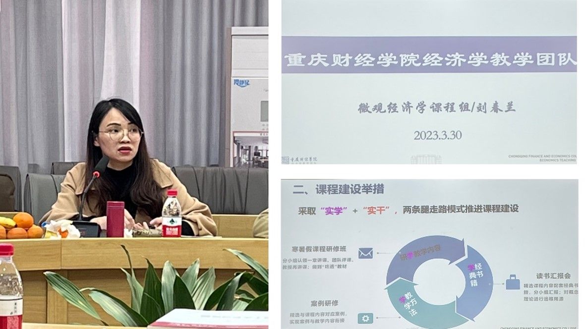 重庆财经学院经济学院刘春兰助理为在座老师分享了重庆财经学院教学团队的《微观经济学》课程的基本情况及脉络、课程建设及举措以及课程建设成效。特别提到“实学”+“实干”,两条腿走路模式推进课程建设。