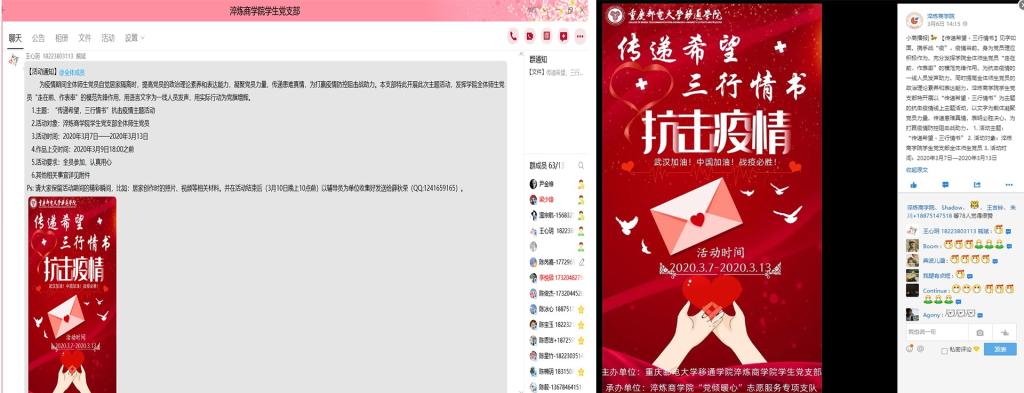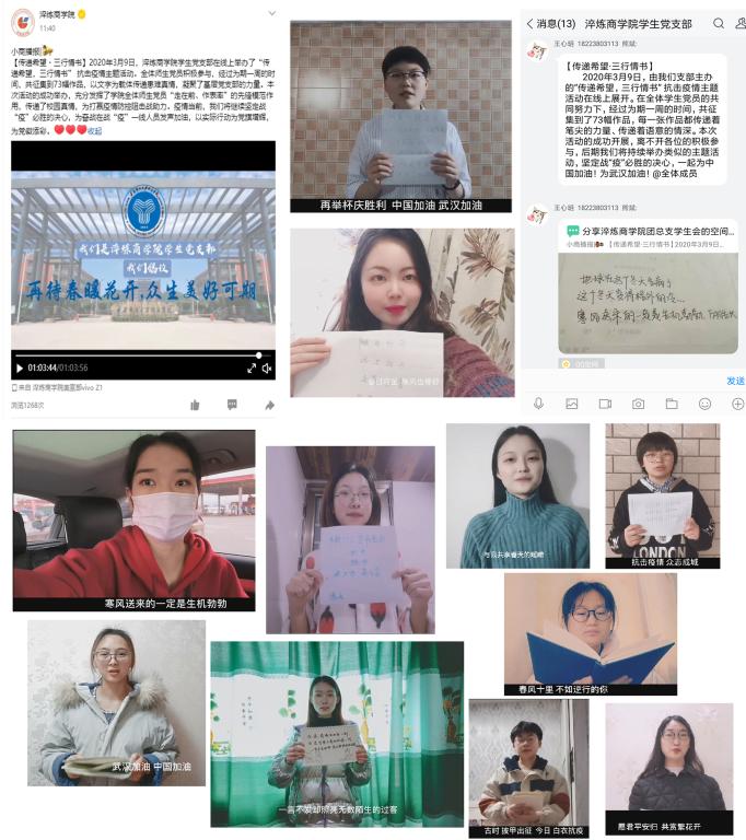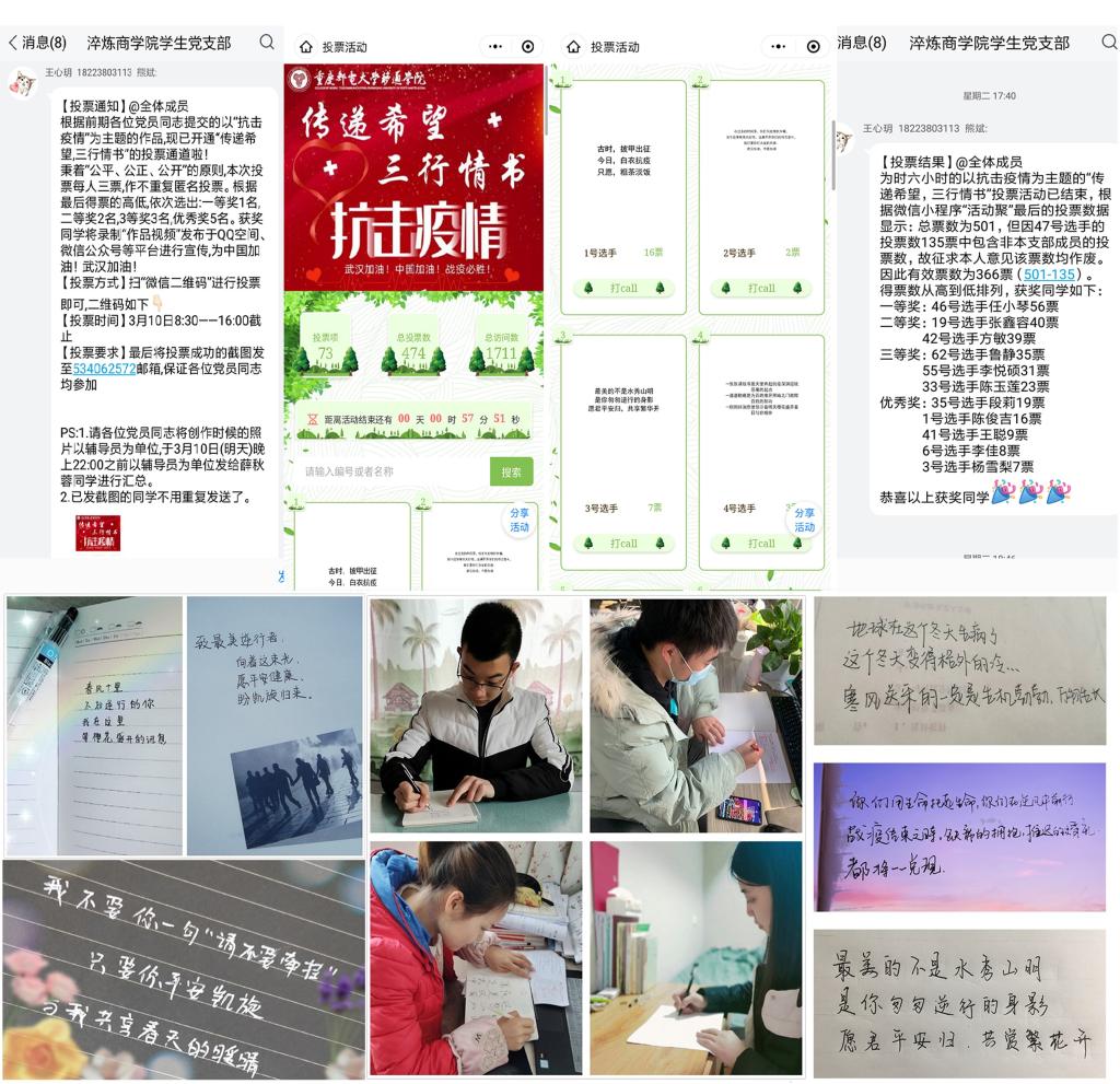 新型冠状病毒疫情来袭,疫情的暴发和迅速扩散,无不牵动着举国上下亿万人民的心。疫情无情人有情,抗击疫情众志成城。疫情当前,淬炼商学院学生党支部积极响应党的号召,虽不能奔赴“前线”,但是同样可以为防控疫情贡献出作为基层党支部的绵薄力量。2020年3月9日下午六点,由淬炼商学院学生党支部主办的“传递希望,三行情书”抗击疫情主题活动在线上展开匿名投票,通过三行情意绵长的语句,道出对于驻守在一线的工作人员的感激和敬佩之情,为他们的坚守带去温暖,坚定战“疫”必胜的决心,与他们并肩战“疫”,让战“疫”线不孤单。