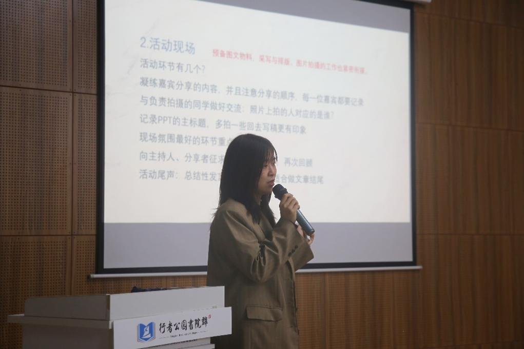 同时本次培训会也很荣幸地邀请到了远景学院钟婷婷老师为同学们分享自己的亲身体验:“大家是不是觉得学习新闻稿对自己没有用?之前我也是这么认为的,我觉得自己作为一个理科生不需要具备这方面的技能,但是后来遇到了需要写新闻稿这种情况的时候,我感觉十分头疼,一篇新闻稿需要写很长的时间……”钟婷婷老师通过自身的经历告诉了大家学习新闻通讯稿的重要性,同时钟老师以自己任课的科目——“生活中的数学思维”为例像同学们讲述,生活中的美学和审美对于生活工作的幸福指数显然是十分重要的,本次新闻通讯稿学习的主题,不仅仅是培养同学们的写作能力,更是培养同学们审美能力,艺术创新等全方位能力的综合培养。