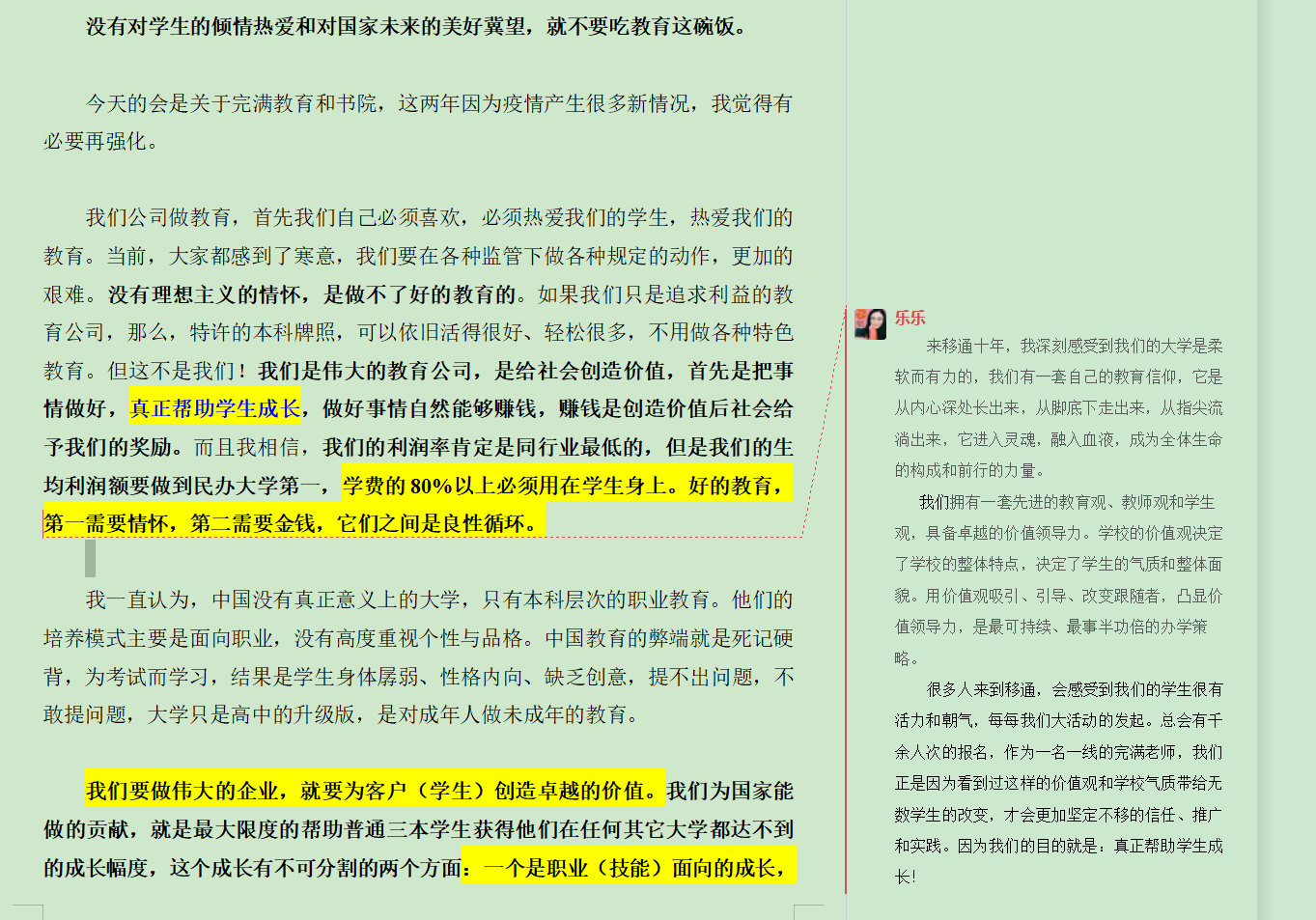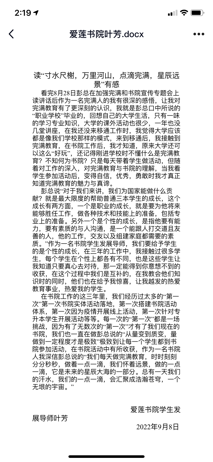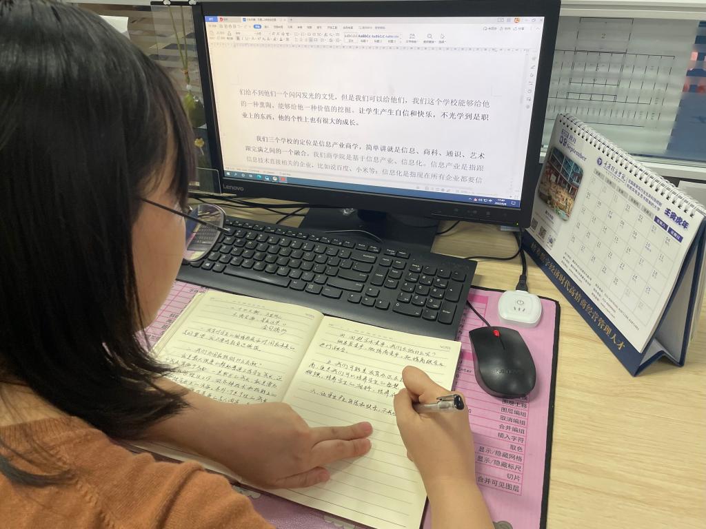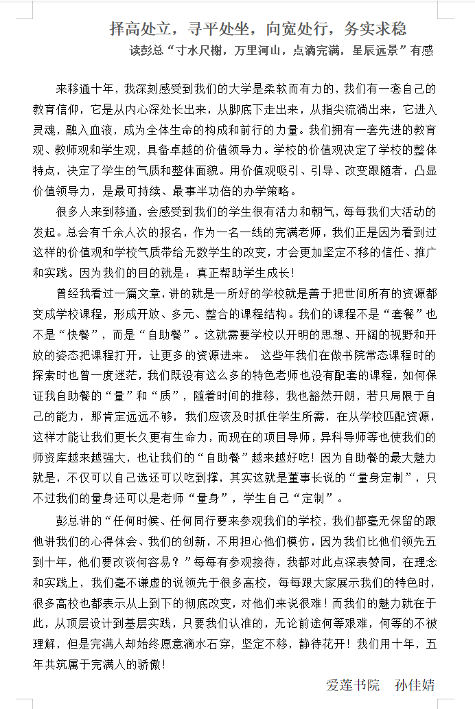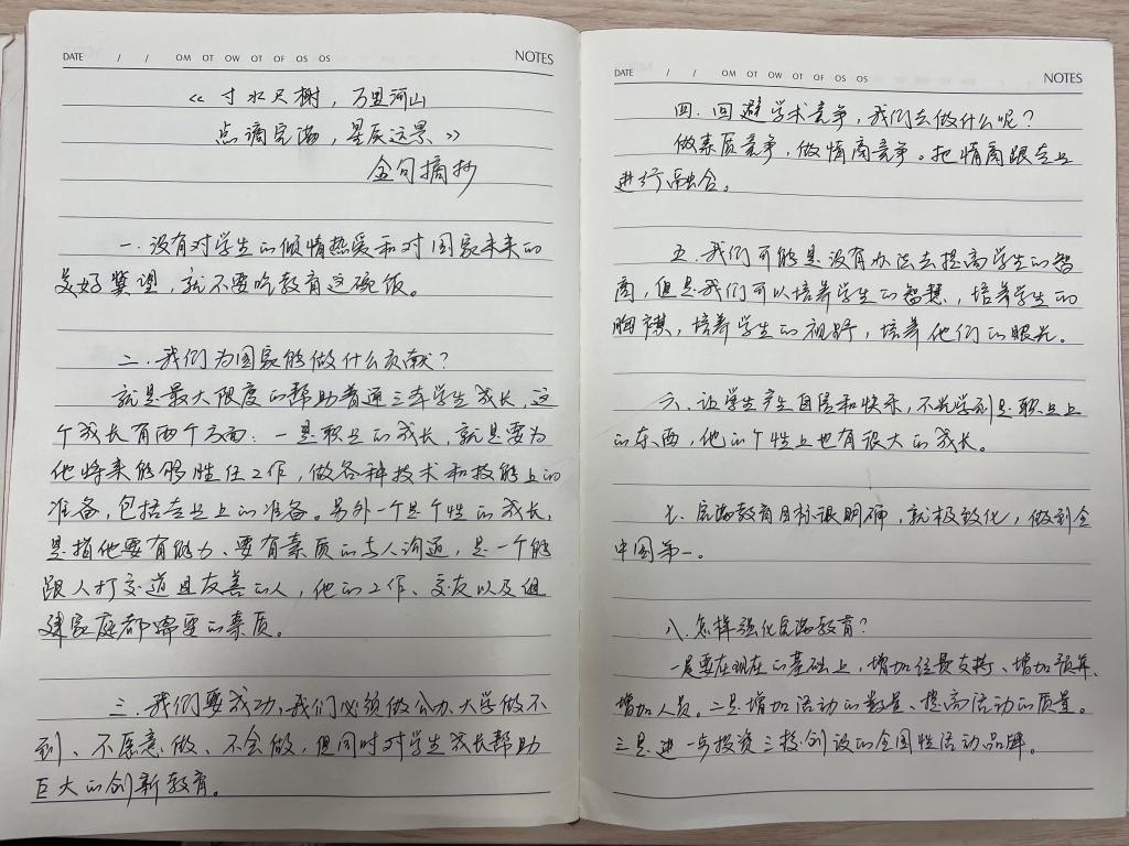 针对讲话内容,爱莲书院综合办公室组织了不同形式的学习,孙佳婧老师以边学边写感想的形式,记录自己的学习过程,叶芳老师则是打印成册,以便可以时常温习翻阅,8日,两位老师结合自身工作将感悟整理成文,互相交换,从不同的角度拓宽学习角度和思路,并结合内容,对新学期的各项事务进行了调整和梳理,务必使理念和实践结合,更好的为学生服务,带给学生最有价值的成长。