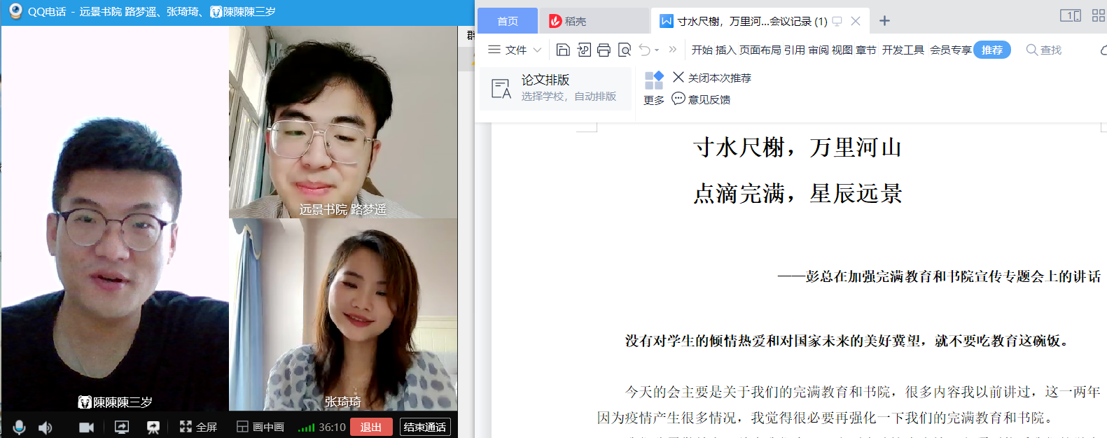 行者公园书院群陈钎华、张琦琦与远景书院路梦遥,三位老师通过云端连线集中学习了彭总在加强完满教育和书院宣传专题会上《寸水尺榭,万里河山,点滴完满,星辰远景》的讲话精神。线上学习中,三位老师首先对彭总的讲话精神逐字逐句进行了研读,并且立足彭总的讲话内容,围绕“完满教育工作者的教育情怀”、“中国高等教育的状况”、“如何将专业集中式书院的育人工作做的更好”等几个方面进行了思考和交流。三位老师一致认为,作为完满教育工作者,作为离学生最近的学生发展导师,一定要有理想、有情怀、有担当。特别是对待工作,要满怀热爱,保持对这份事业的热情,在工作中要持续了解学生需求,时刻关注学生发展,不断激发学生热情,才能更好的帮助学生成长,也才能让我们自身与学生、与学校一起在完满之路上奔向万里河山!