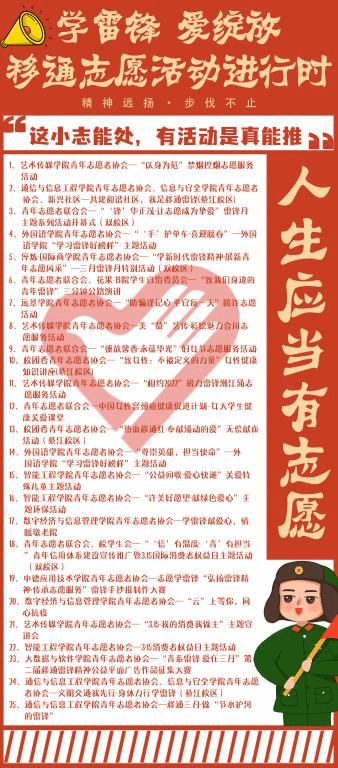 为积极宣传学习雷锋的精神,鼓励大家参与到志愿服务活动中,做雷锋精神的践行者。本次活动主要通过创新“4+1”模式,即4个理论知识+1场志愿实践。参与者可以通过6个活动展示区对中国志愿服务日介绍、雷锋及雷锋月介绍、移通志愿服务介绍以及志愿服务基本知识4个理论进行学习后,再参与到志愿实践中。在志愿实践中,围绕97个志愿服务专项支队活动创新设出志愿体验卡,抽取专属参与者的志愿服务卡,开展此类志愿服务,让大家亲身参与到志愿者服务活动中。从亲身经历体验志愿,到用实际行动践行志愿。让移通学子在沉浸式的志愿体验中扬雷锋精神,做志愿达人。