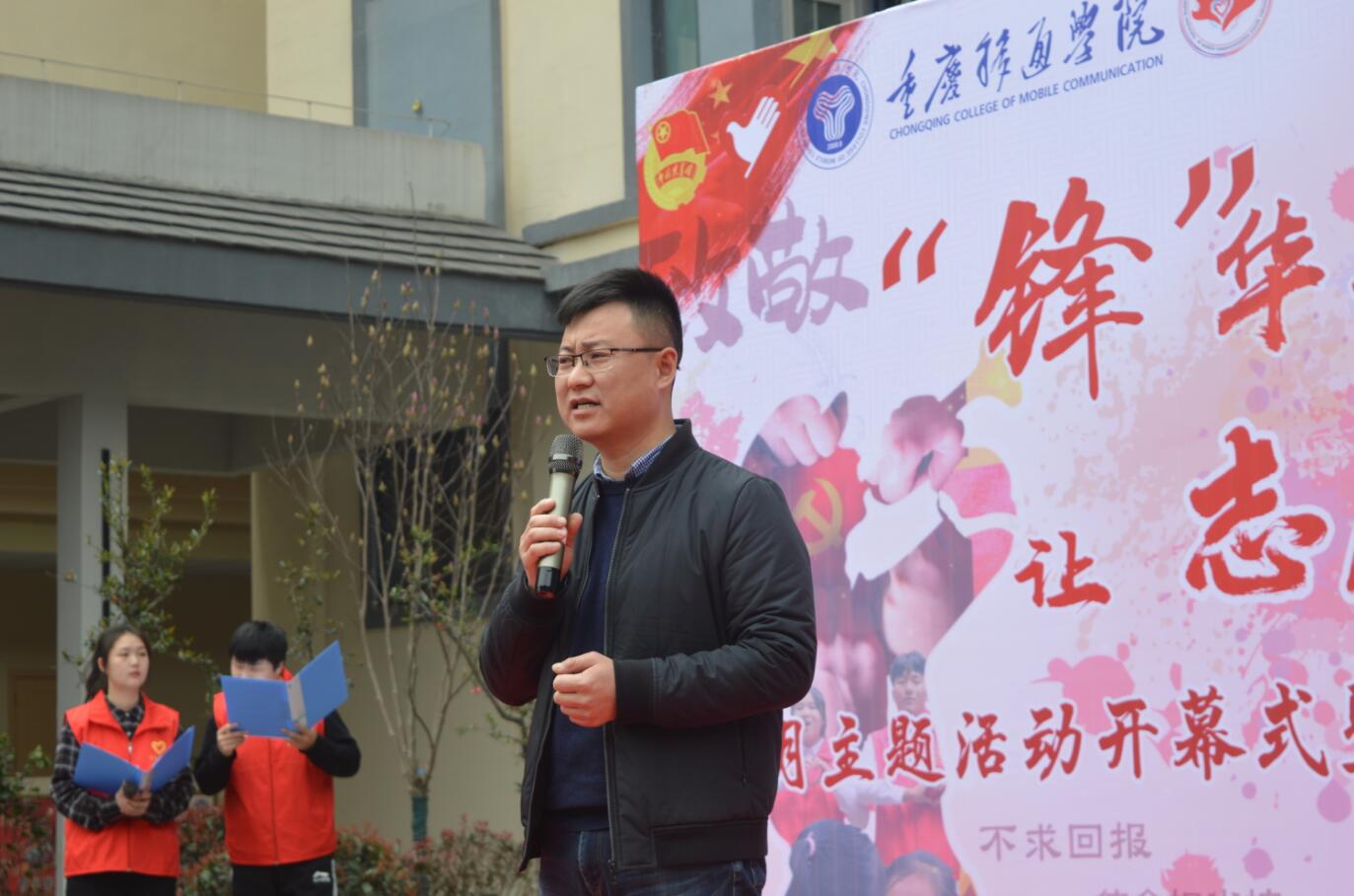 (此图为綦江校区团委负责人蔡星宇老师宣读《重庆移通学院爱心基金管理条例》)
