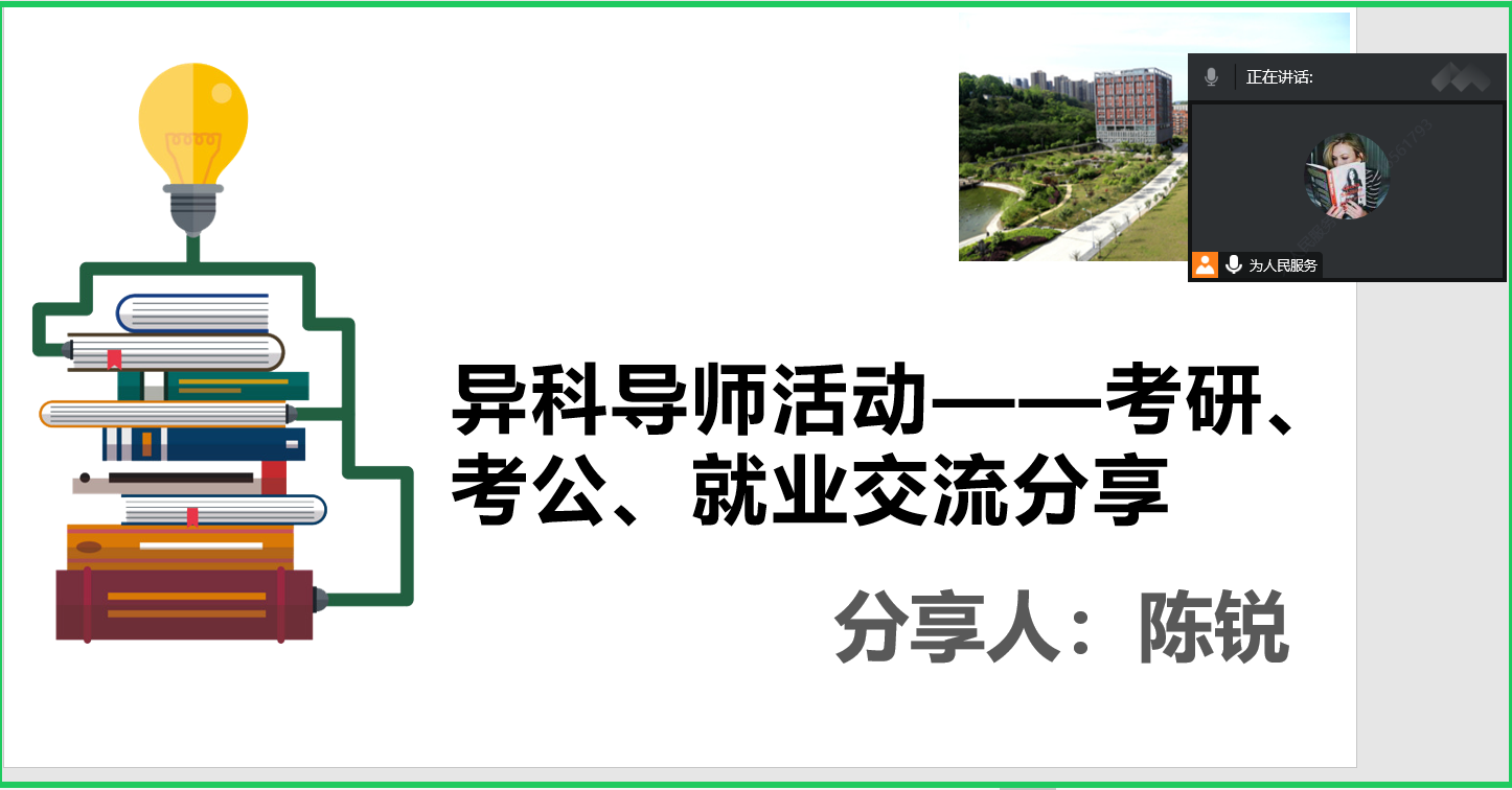 为引导学生们在疫情期间学习压力、心理焦虑等问题。陈锐异科导师小组成员于11月17日下午在腾讯会议进行线上“敢问路在何方”为主题的考研、考公、就业分享会。